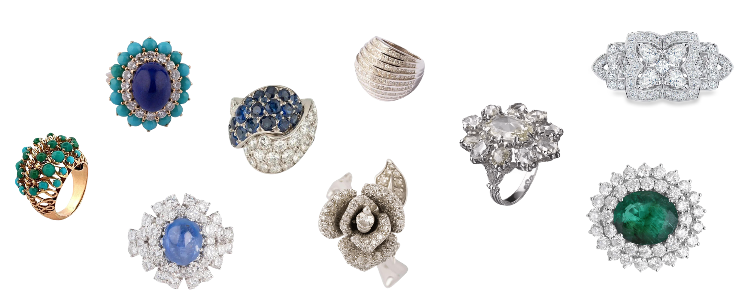 In response to these rules, to proclaim their equality with men, women began adorning their fingers with extravagant rings to attract everyone's attention . These cocktail rings typically feature a large center stone accented by smaller gems, mounted on raised supports to amplify their brilliance with a dramatic halo effect. This design results in a refined and distinctive piece of jewelry.