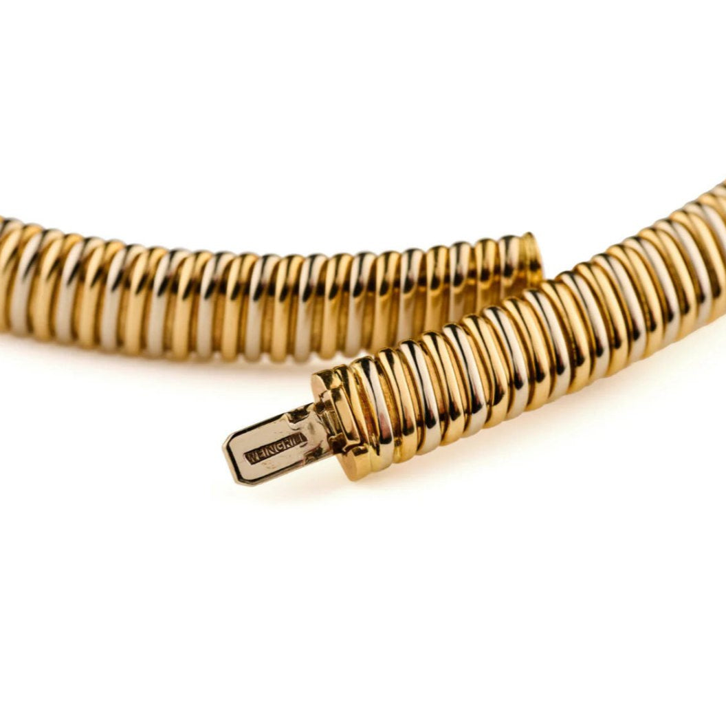 Comme son nom le laisse deviner, le collier tubogas imite les tuyaux de gaz. Ce bijou s’inspire directement des tubes souples utilisés par les professionnels du BTP : sa structure forme une bande flexible, composée de spirales arrondies ou de chevrons, assemblés habilement sans soudure. Les colliers tubogas sont apparus dans les années 1920 et ont connu un essor important quelques années plus tard, entre 1930 et 1940. Ces pièces originales, qui rappellent la silhouette sinueuse d’un serpent, ont attiré l’œil des joailliers à cette époque, qui en ont imaginé des versions en divers métaux précieux, comme l’or jaune, l’or rose, l’or blanc ou encore le laiton plaqué.