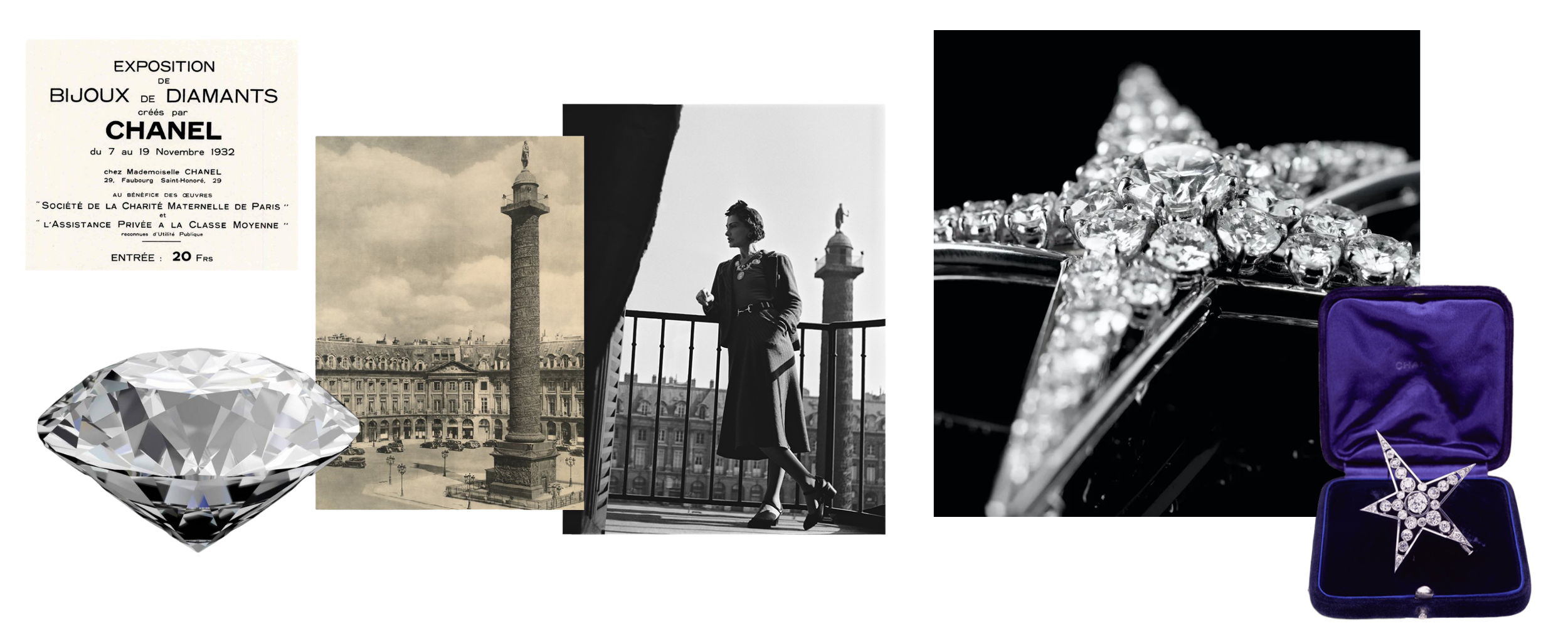 En 1932, Gabrielle Chanel lança sa première et unique collection de Haute Joaillerie qu’elle nomma “Bijoux de Diamants”. La collection comprenait 49 pièces conçues par les ateliers parisiens Lemoine et Rudhart, faites de diamants blancs et jaunes montés sur platine et or jaune. Les bijoux s’inspirent des étoiles et de la liberté, destinés à être portés au quotidien. Cette idée provient de son enfance et des années passées à l’abbaye d’Aubazine en Corrèze, où elle se souvient des jeux de marelle dans la cour, intégrant des symboles tels que le soleil, la lune, la comète et les étoiles.