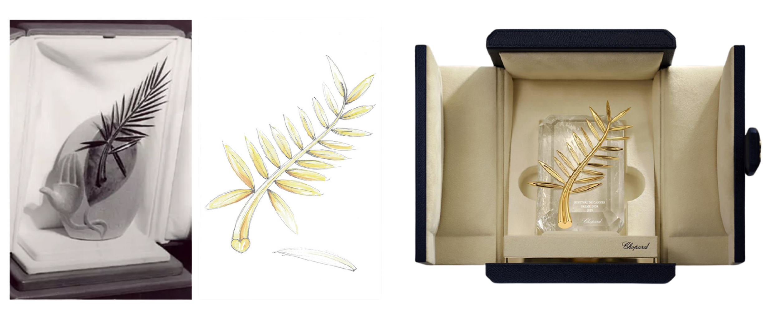La première Palme d’Or a été dessinée par la joaillière et graveuse française Lucienne Lazon en 1955. Son design a connu plusieurs variantes au fil des décennies, jusqu’à ce qu’en 1998, Caroline Scheufele — coprésidente et directrice artistique de la maison suisse Chopard — imagine une nouvelle version contemporaine du trophée.