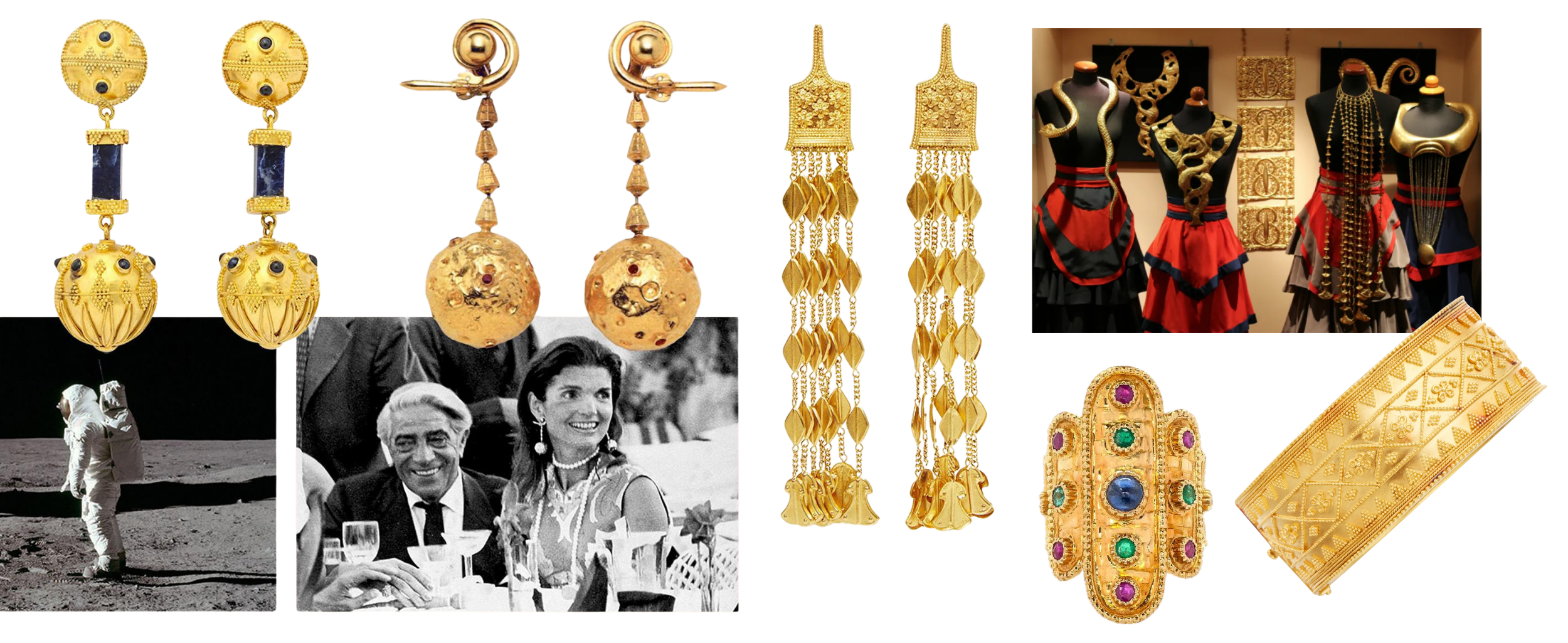 En 1969, Aristote Onassis commande à Ilias Lalaounis une paire de boucles d’oreilles pour le 40ᵉ anniversaire de sa femme Jacqueline Kennedy. Ces bijoux, représentant la Lune avec des cratères incrustés de rubis et des clips en forme d’orbite de vaisseau spatial, rendent hommage à la mission Apollo 11 et au premier pas de l’Homme sur la Lune.