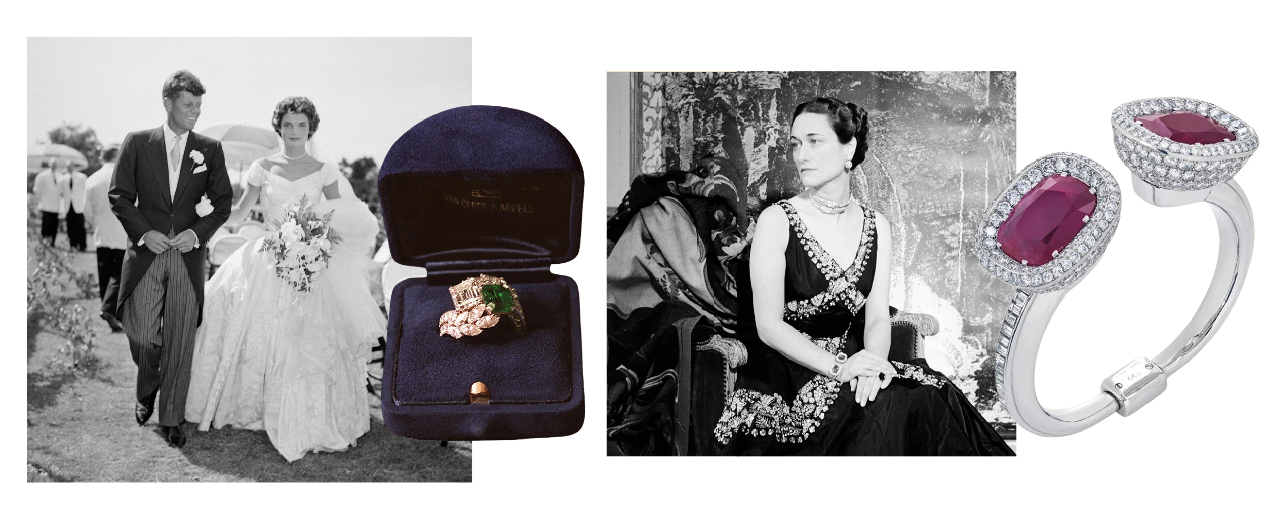 D’après une anecdote célèbre, Jackie Kennedy a fait remodeler sa bague de fiançailles "Toi et Moi" de Van Cleef & Arpels, offerte par John Fitzgerald Kennedy lors de leur demande en mariage.