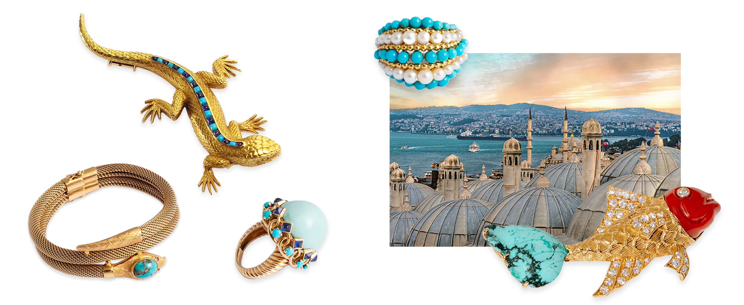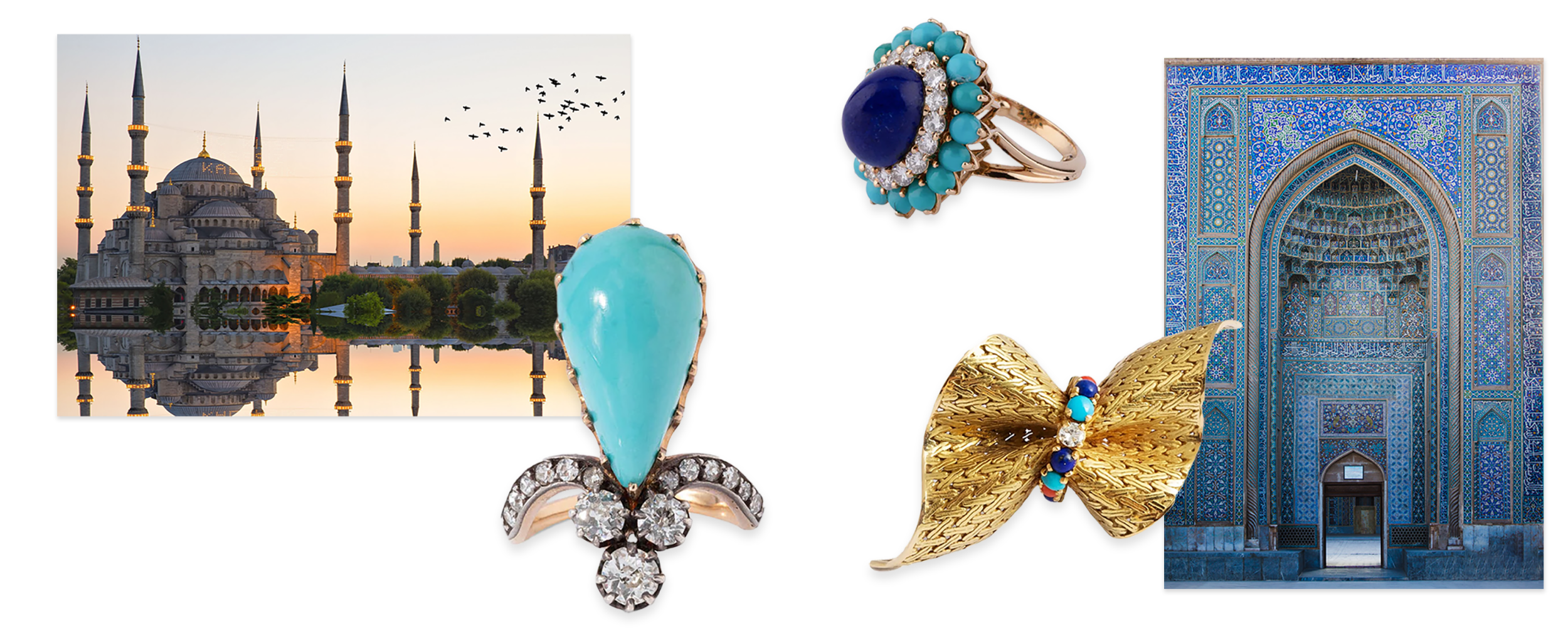 La turquoise a été introduite en Europe grâce aux marchands vénitiens au cours des Croisades (XIe–XIIIe siècles). Bien qu’elle ne provienne pas de Turquie, la pierre y transitait via les routes commerciales reliant l’Asie à l’Europe, ce qui explique son nom dérivé de ce pays, surnommée alors la "pierre turque".