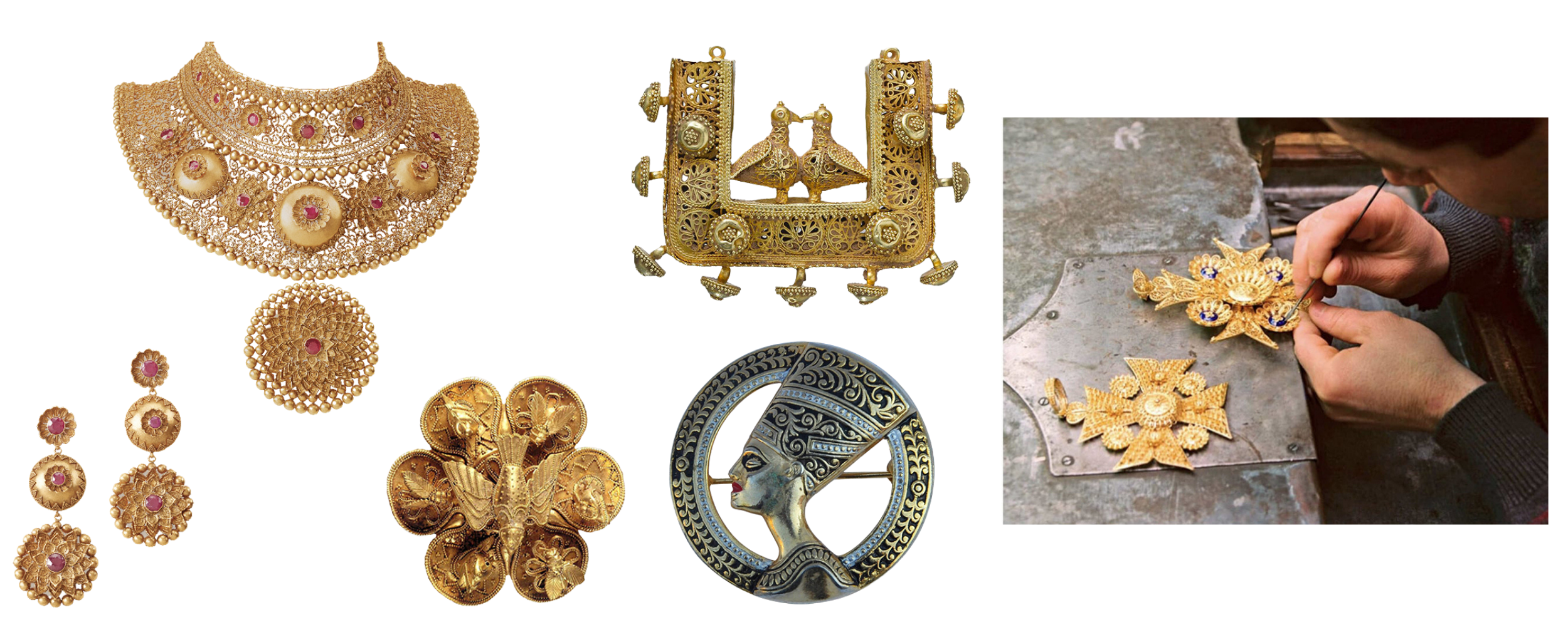 Les plus anciens bijoux en filigrane connus ont plus de 7 000 ans et ont été découverts en Égypte. Avec le temps, le filigrane s’est répandu dans de nombreuses cultures et régions du monde, notamment en Europe et en Asie.