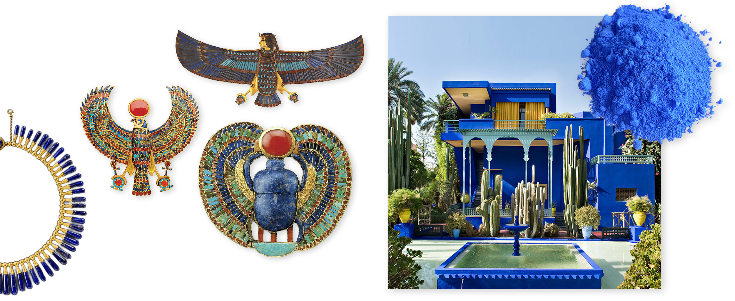 Le lapis-lazuli a également donné naissance au pigment bleu outremer, un pigment naturel obtenu en broyant la pierre, très prisé pour ses nuances profondes utilisées dans la peinture et les enluminures du Moyen Âge et de la Renaissance. Ce pigment a été synthétisé en 1826, rendant son usage plus accessible. Son usage artistique perdure encore aujourd’hui, comme en témoigne la célèbre villa Jardin Majorelle au Maroc, entourée d’un extérieur somptueux et ornée d’un bleu intense.