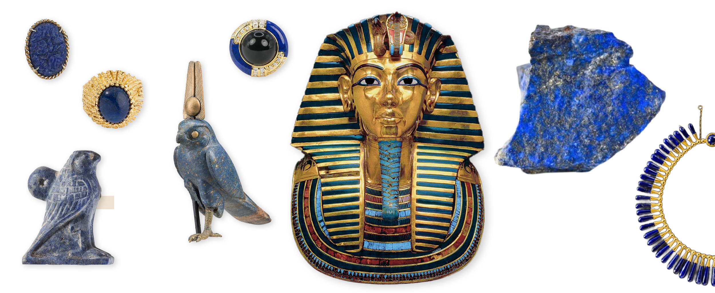 Très rare, cette pierre est extraite principalement dans les mines de Sar-e-Sang en Afghanistan, exploitées depuis plus de 6 000 ans, et était associée au pouvoir, portée par les princes et les rois. Le masque funéraire de Toutankhamon, composé de 10 kg d’or et orné de pierres précieuses, incluait d’ailleurs du lapis-lazuli. Selon les croyances égyptiennes, l’or représentait la chair des dieux et le lapis-lazuli leurs cheveux.