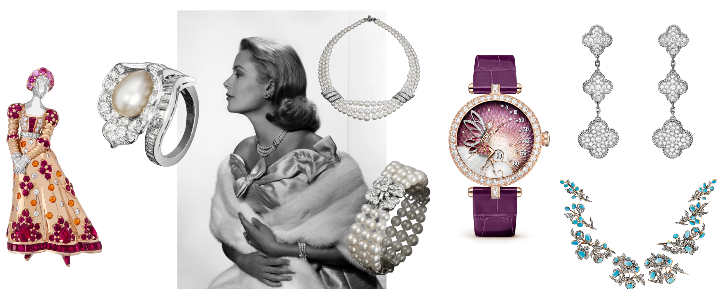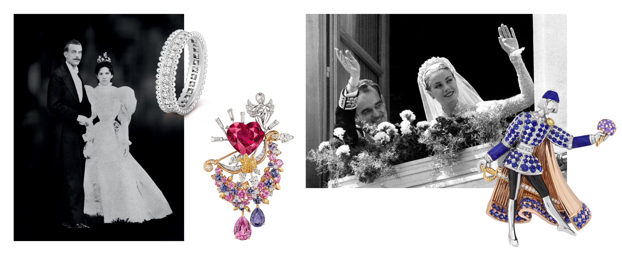 Depuis sa fondation, Van Cleef & Arpels puise son inspiration dans les émotions, les contes de fées et les grands moments de la vie. Parmi ses nombreuses créations emblématiques, l’histoire d’amour entre Grace Kelly et le Prince Rainier de Monaco demeure un symbole fort. En 1956, à l’occasion de leur mariage, Grace Kelly reçoit un somptueux cadeau de Van Cleef & Arpels : un ensemble de perles fines et de diamants, qu’elle portera tout au long de sa vie. Quelques mois après, la maison est honorée du titre de "fournisseur breveté de la Principauté de Monaco", témoignant de son lien privilégié avec la royauté.