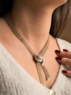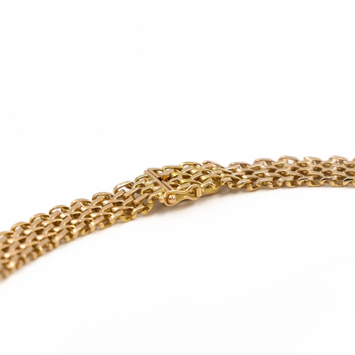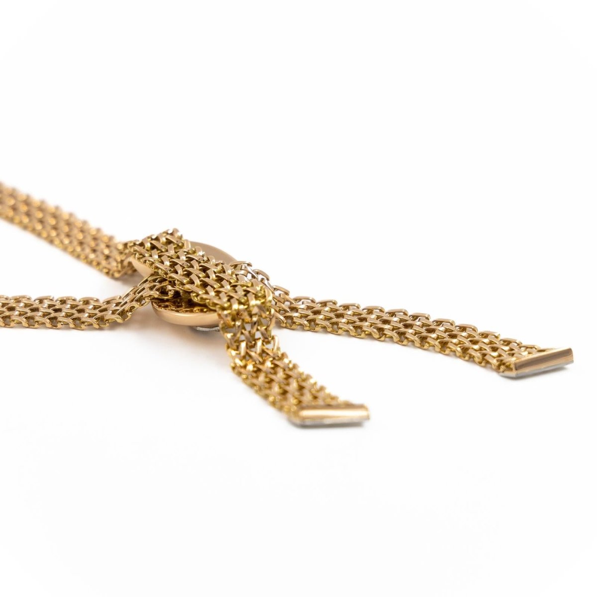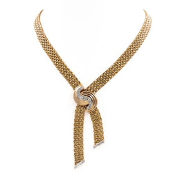 Collier négligé en or jaune 750 millièmes (18 carats) et platine 950 millièmes. serti de 18 diamants taille ancienne estimés G/SI. dont 9 d'environ 0.10 ct chacun. 4 d'environ 0.05 ct chacun et 5 d'environ 0.02 ct chacun. Poids total estimés des diamants: 1.20 cts. Longueur: 42.5 cm. Largeur: 2.45 cm. Poids total: 60.86 g. Poinçon tête de hibou et mascaron. Excellent état