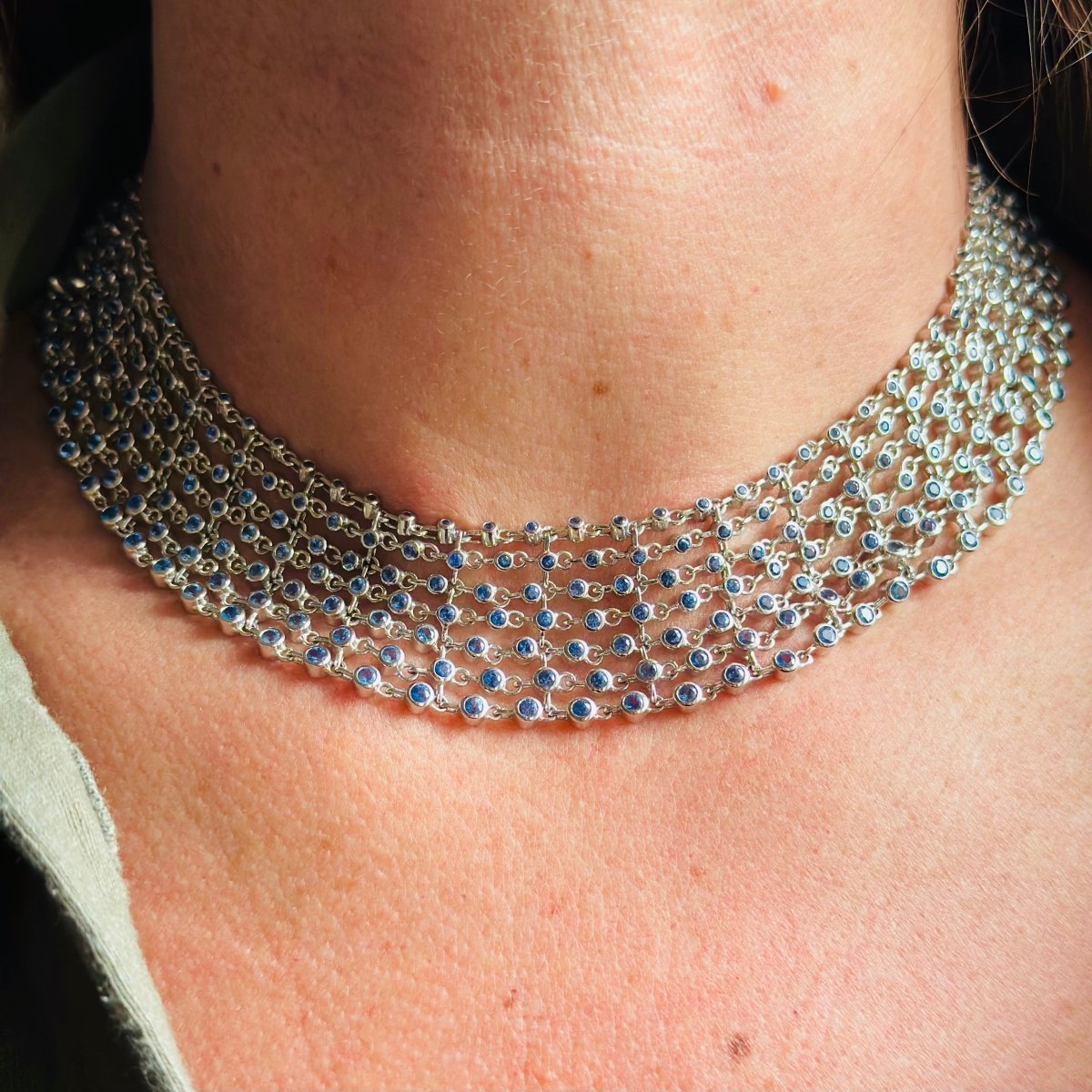 - À longueur intermédiaire, un collier or blanc porte un pendentif diamant, un saphir bleu nuit, une topaze claire ou une améthyste.