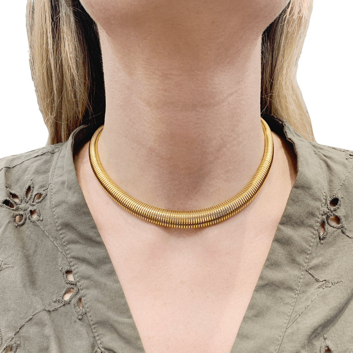 L'or rose massif reste notre préférence lorsqu'il s'agit de haute joaillerie. Nous accueillons aussi, selon la pièce, des colliers en or rose et or blanc, voire des éléments en argent pour un contraste clair. Le marché parle de plaqué or rose, d'oxyde de zirconium, d'acier inoxydable ; ces termes existent et certains bijoux anciens ou plus accessibles les emploient. Quand une pièce présente un plaqué or rose ou des pierres de substitution, l'information est donnée dans la fiche produit de façon transparente. Notre collection tend vers les matériaux nobles, vers les diamants plutôt que leurs imitations, mais nous savons aussi reconnaître la qualité d'un dessin lorsqu'il est juste, même s'il fait appel à d'autres solutions. Ce qui compte est la vérité de la pièce : l'alliage, les matériaux, la maille et le serti doivent répondre au niveau d'exigence que nous nous fixons.
