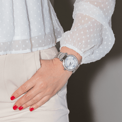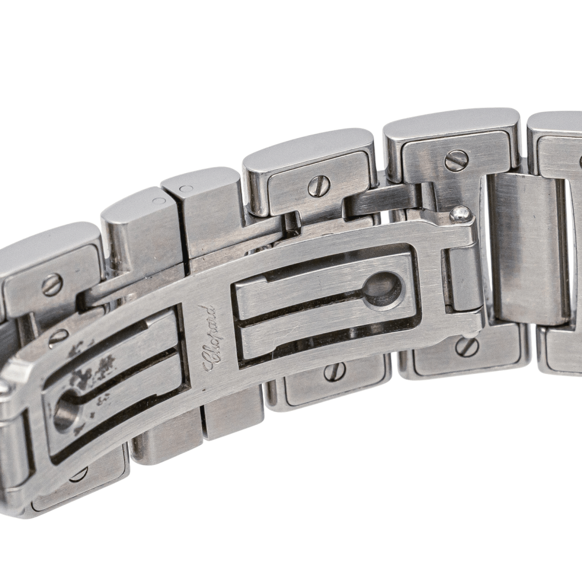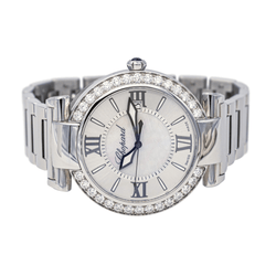 Montre dame signée de la Maison Chopard. modèle Impériale. en acier. mouvement mécanique à remontage automatique. boîtier 40 mm. cadran argenté avec centre en nacre. chiffres romains. date. lunette sertie de 30 diamants. pour un total d'environ 2.41 cts. sertie d'une améthyste sur la couronne de 0.15 ct. bracelet acier. boucles déployante. verre saphir. Taille poignet : jusqu'à 20 cm. largeur bracelet : 1.8 cm. Full set. sous garantie. boîte et papiers d'origine. numérotée. excellent état. jamais portée.