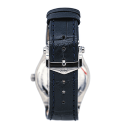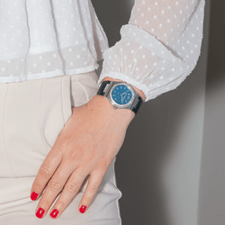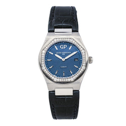 Montre Girard-Perregaux modèle Laureato acier. cadran bleu guichoché à index bâtons. sertie de 56 diamants. 8 diamants taille brillant. d'un poids total 0.48ct (chaque diamant d'un poids d'environ 0.06 ct). 48 diamants taille brillant. d'un poids d'environ 0.34ct (chaque diamant d'un poids d'environ 0.007 ct). mouvement à quartz. boîtier 34 mm. verre saphir. bracelet cuir à boucle papillon. (taille poignet 20 cm ajustable. largeur bracelet 2.10 cm en chute). poids total : 53.58 g. full set (boite et papier d'origine). année 2025. garantie. excellent état jamais portée