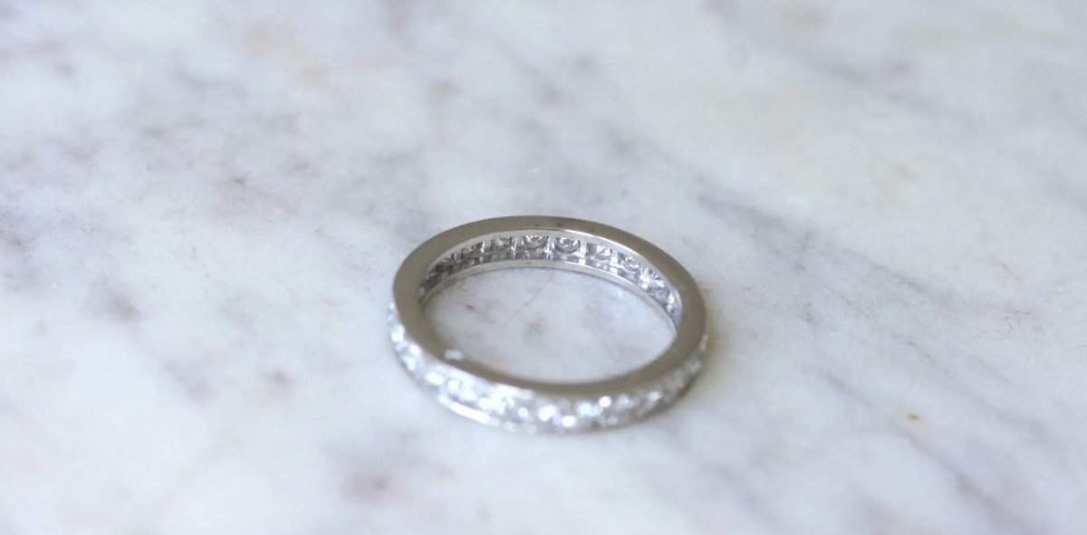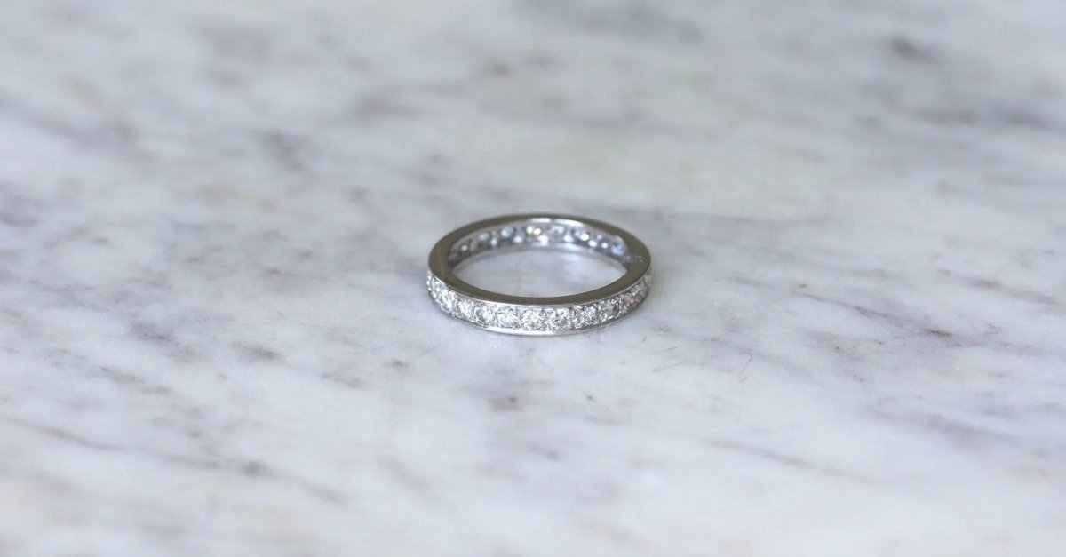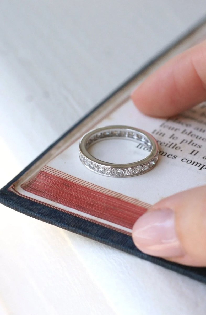 Alliance en platine (poinçon tête de chien) sertie de diamants taillés en brillant, dont le poids total est estimé pour environ 1,25 Cts.Couleur des diamants estimée H, et pureté estimée VS à SI. Travail Français, Art Déco, circa 1920. Poids brut: 3.77gTour de doigt: 54 (diamètre 17,20/ US 6.75)Hauteur: 0,30cm État: très légères micro rayures sur les parties platine, voir photos. A l'origine simple anneau, l’alliance représente l’amour éternel, et se pare ici d'étincelants diamants. Toutes nos bagues de fiançailles.