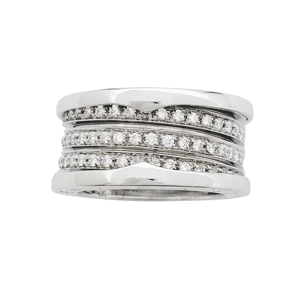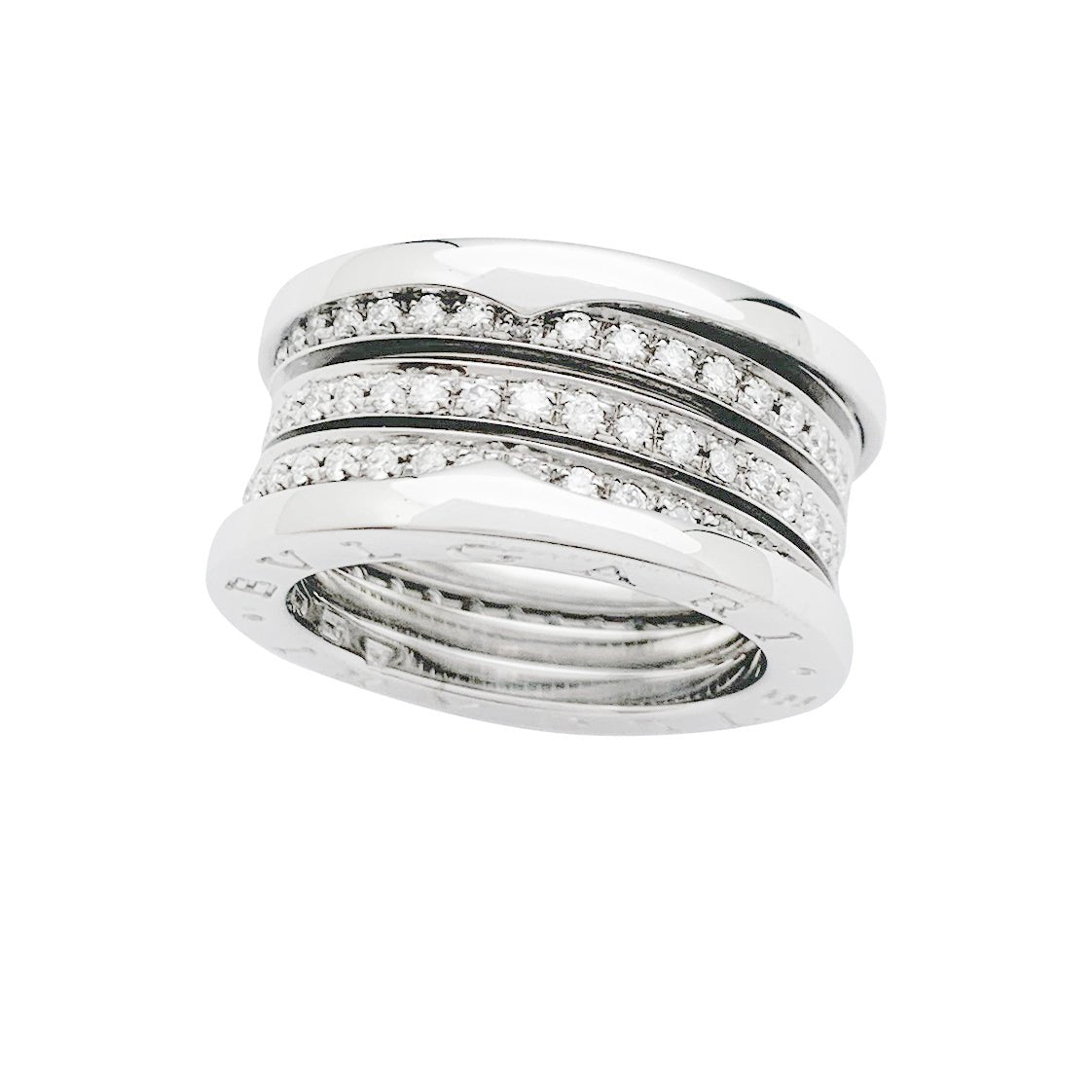 Une bague bandeau signée de la Maison Bulgari, collection “B.Zero1”, en or blanc 750/000 partiellement pavée de diamants taille brillant. Largeur : 10 mm Poids : 14.4 grammes Poids du diamant : 1 carat environ Tour de doigt : 54