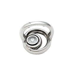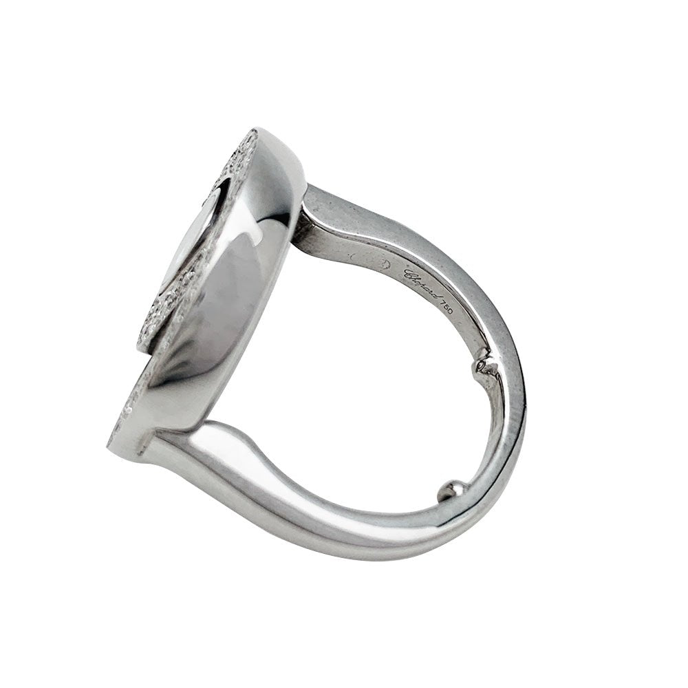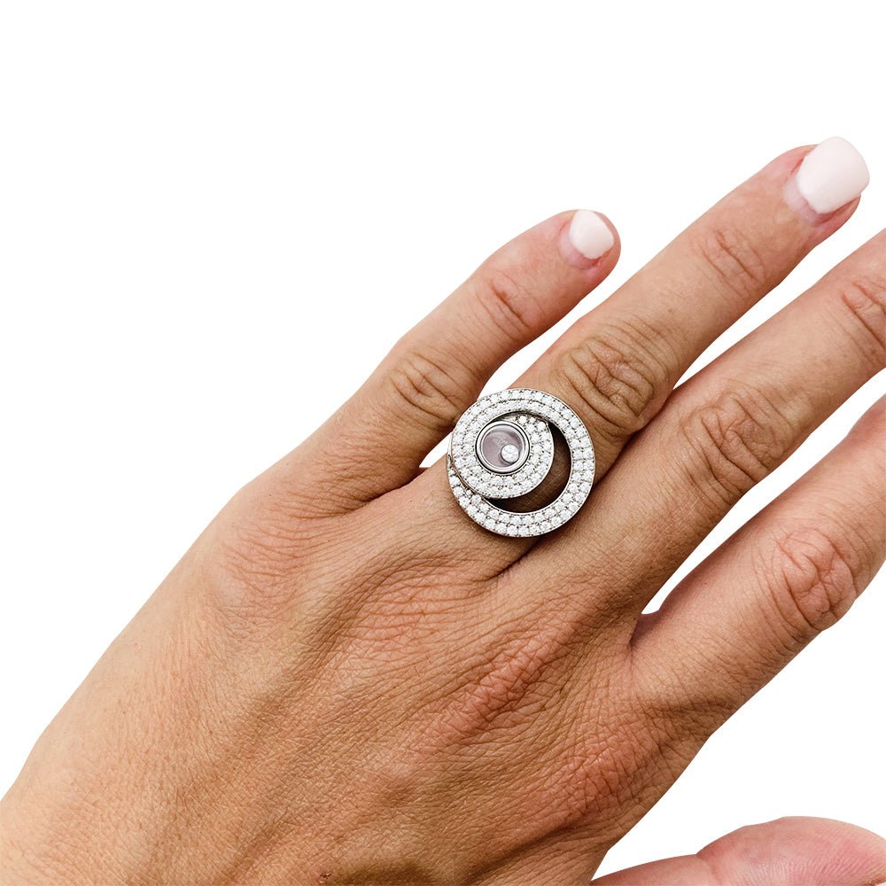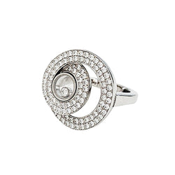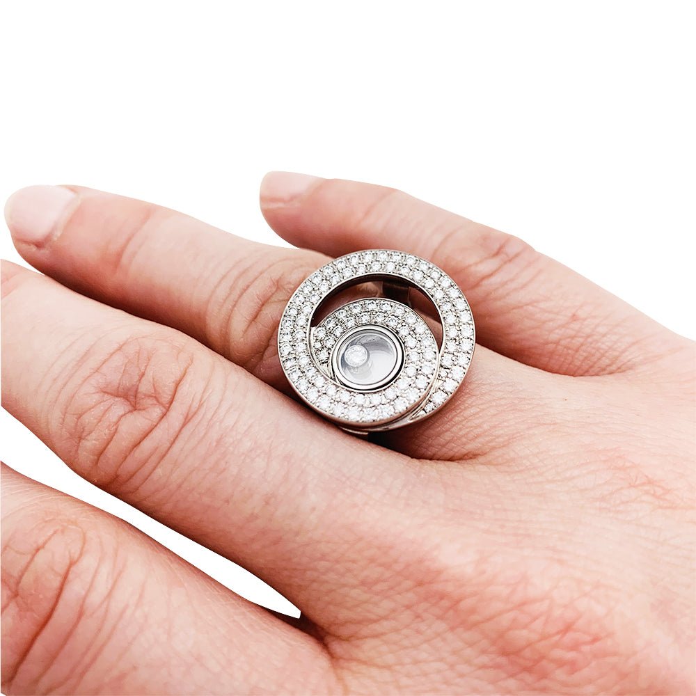 Une bague signée de la Maison Chopard, modèle “Happy Diamonds”, en or blanc 750/000, figurant deux cercles entrelacés pavés de diamants taille brillant protégeant un diamant mobile entre deux disques de verre. Diamètre : 20 mm Poids : 15,9 grammes. Poids du diamant : 0,77 carat Tour de doigt : 52