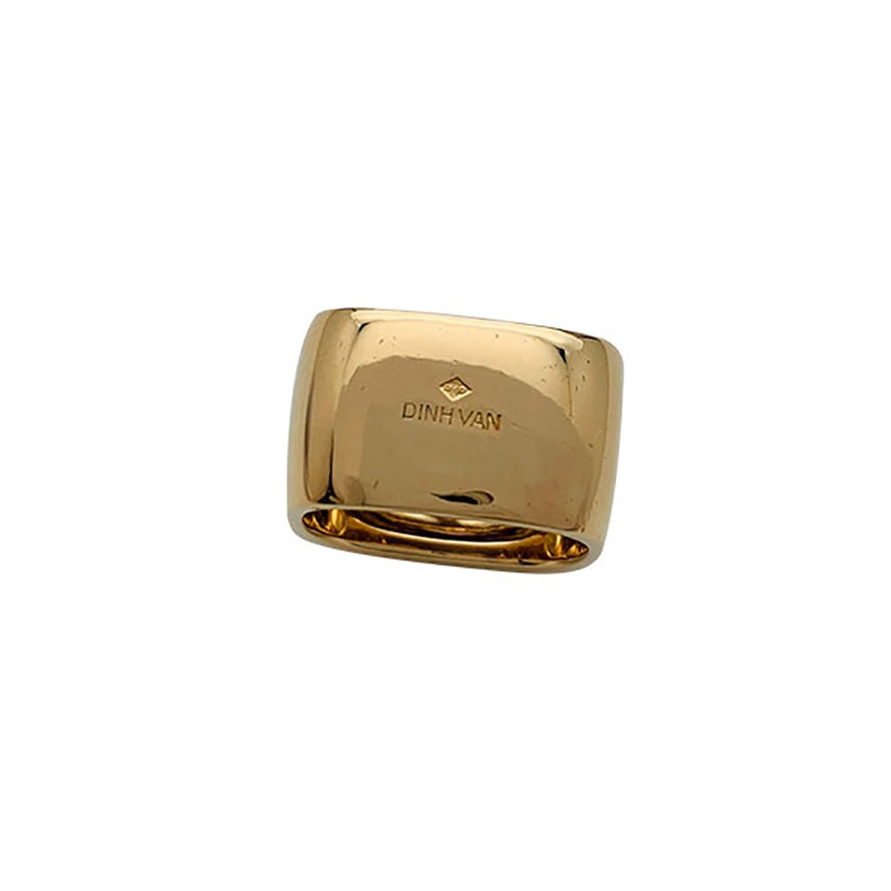 Une bague carrée signée de la Maison Dinh Van, modèle “Margot”, en or jaune 750/000 centrée d’un rubis ovale d'environ 2 carats. Certificat Gem Paris. Longueur : 6 mm Largeur : 11,5 mm Hauteur : 5 mm Poids : 17,1 grammes Tour de doigt : 47