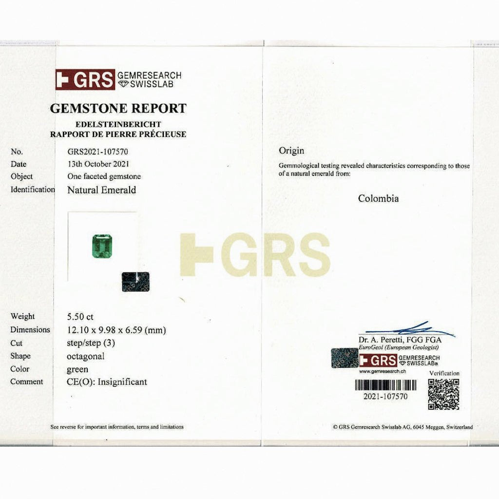 Une bague en or blanc 750/000 centrée d’une émeraude à pans coupés pesant 5,50 carats en serti clos et entourée de 22 diamants taille princesse. Certificat GRS : origine Colombie. Longueur : 18 mm Largeur : 16 mm Hauteur : 6 mm Poids du diamant : 1,03 carat Tour de doigt : 53