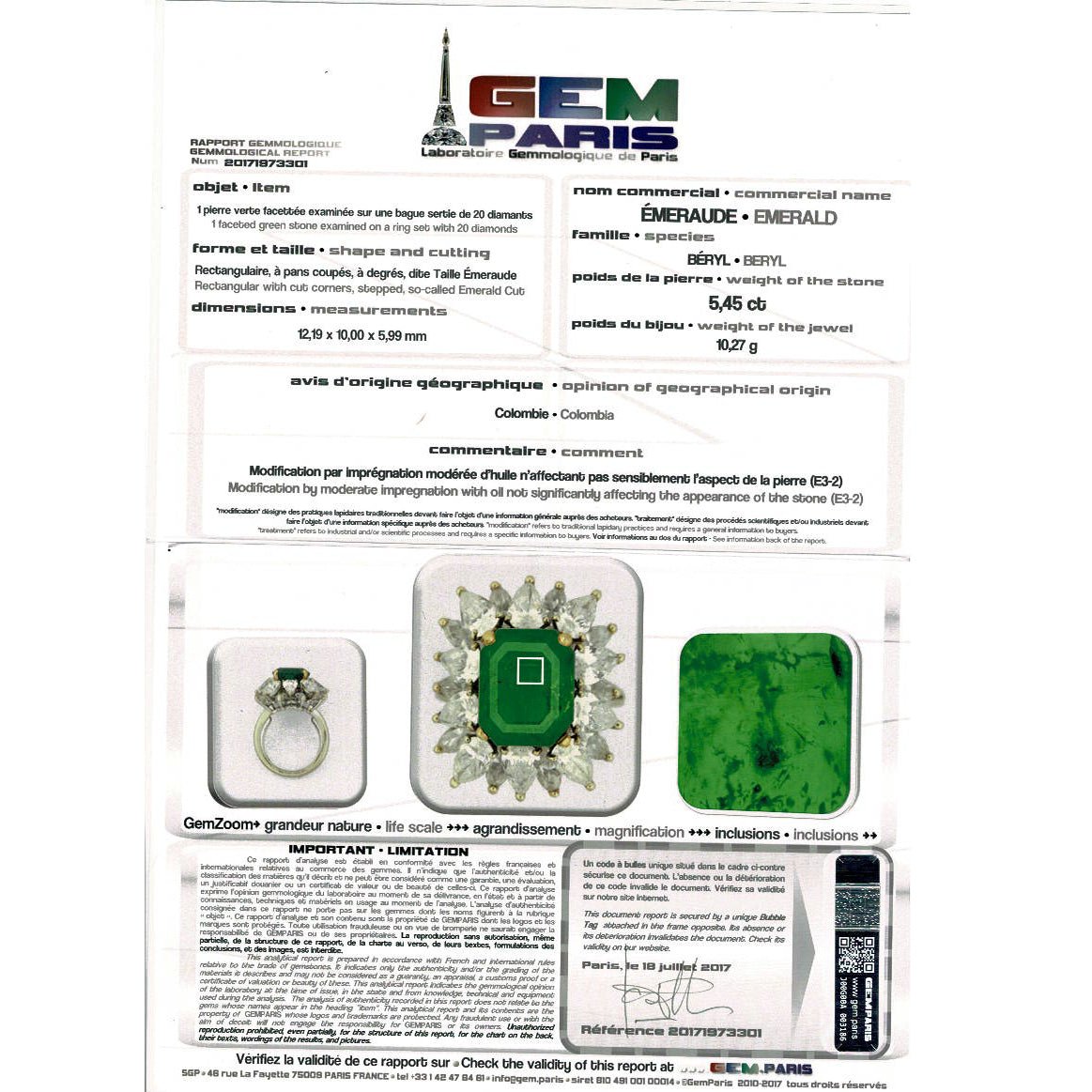 Une importante bague en or blanc et jaune 750/000 sertie d'une émeraude rectangulaire à pans coupés de 5,45 carats d'origine colombienne. Elle est entourée par deux rangées superposées de diamants taillés en poire et de diamants taille navette. Poids des diamants : 10 poires pour environ 3 carats 10 navettes pour environ 2 carats. Qualité des diamants : F/G-VVS Certificat du Laboratoire GEM de Paris. Longueur : 25 mm. Largeur : 22 mm. Poids : 10,3 grammes. Poids du diamant : Environ 5,00 carats. Tour de doigt : 51