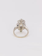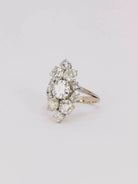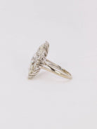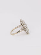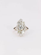 Bague marquise vintage or blanc diamants taille ancienne Bague marquise en or blanc 18k (750°/°°) sertie en son centre d’un diamant taille ancienne pesant environ 1,1 carat (de qualité H SI2, propre à l’oeil nu) dans un entourage de diamants taille ancienne pesant environ 2 carats au total (de qualité G à K, VS à SI2 tous propres à l’oeil nu). Travail français vintage des années 1970. Tour de doigt 53, mise à taille possible Poids brut : 6,85 grammes