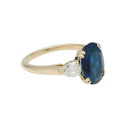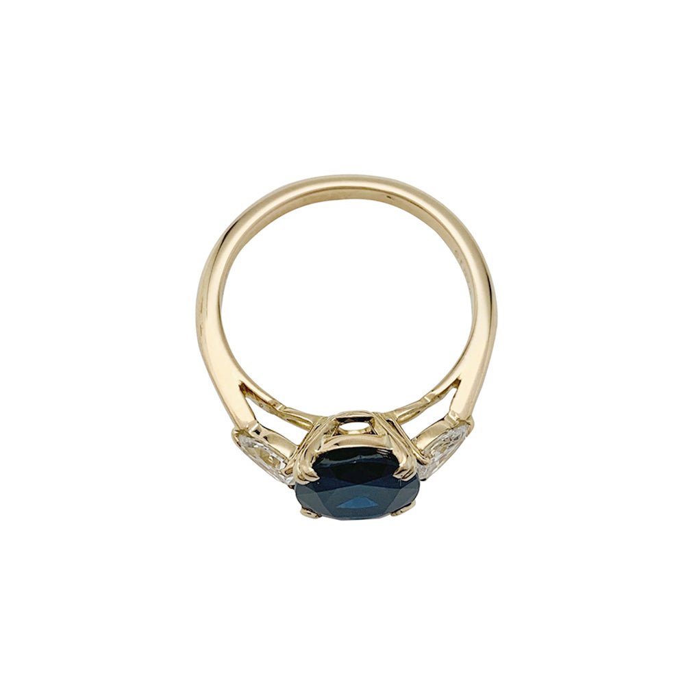 Une bague signée de la Maison Mauboussin, en or jaune 750/000, centrée d’un saphir pesant 3.44 cts, épaulé de 2 diamants taille poire d'un poids total de 0.63ct. Gisement thaïlandais, modification thermique. Poids : 4,5 grammes. Poids du diamant : 0.63 ct au total Tour de doigt : 55