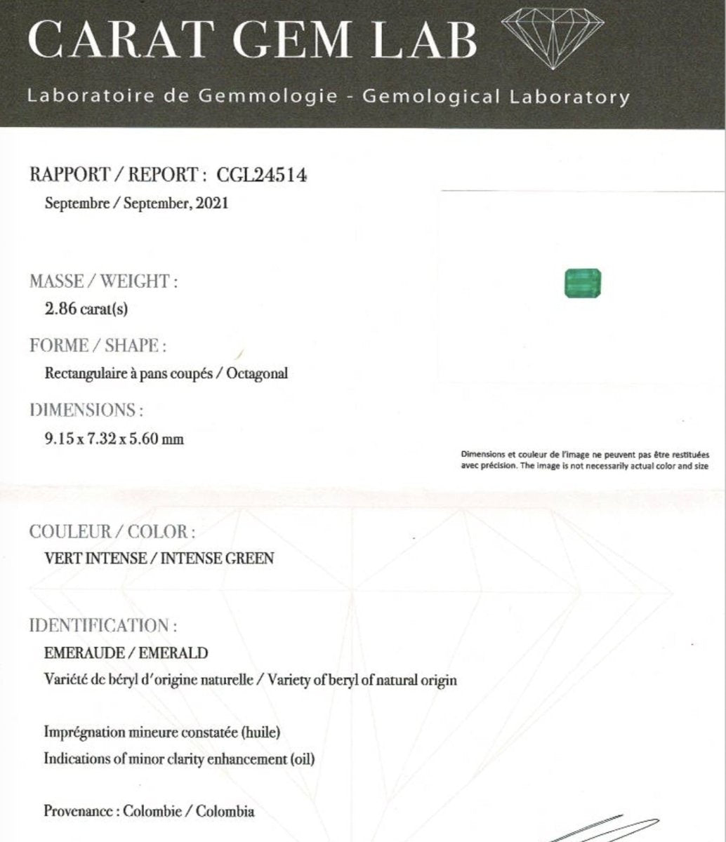 Une bague or jaune 750 sertie d’une émeraude Colombienne pesant 2,86 carats et de diamants baguettes. Certificat du Laboratoire Carat Gem Lab. Largeur : 17 mm Poids : 14,2 grammes Poids du diamant : environ 3 carats Tour de doigt : 58