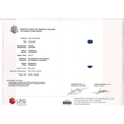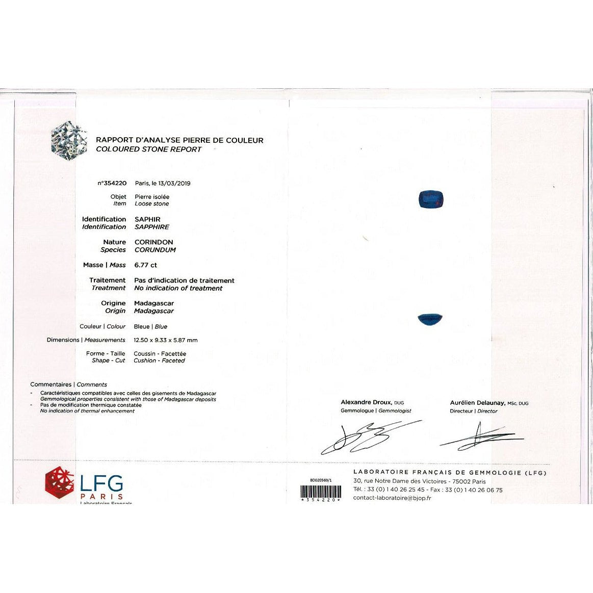 Une bague en or blanc 750/000, sertie d’un saphir de taille coussin épaulé de diamants taille baguette. Poids du saphir : 6,77 carats. Provenance du saphir : Madagascar Certificat LFG n°354220 le 13/03/2019 indiquant l'absence de traitement thermique. Poids : 5,9 grammes Tour de doigt : 54