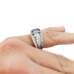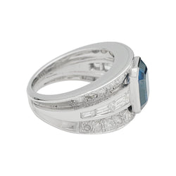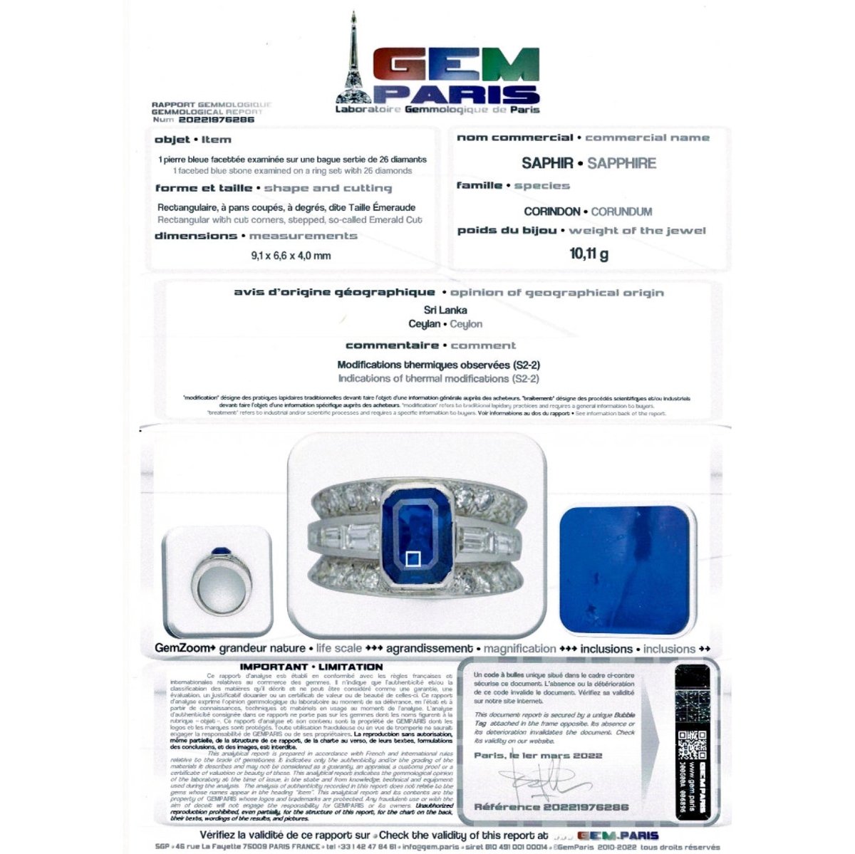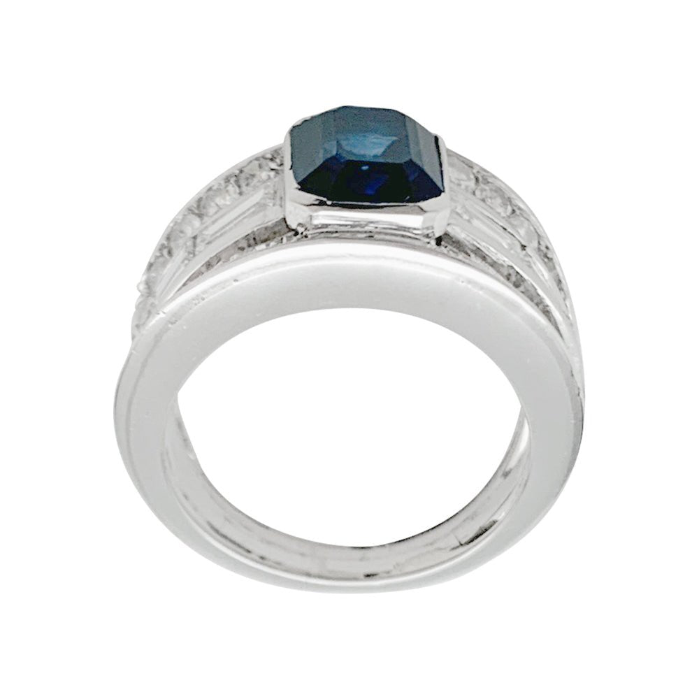Une bague large en platine 950/000 centrée d’un saphir rectangulaire à pans coupés pesant environ 2 carats épaulé de diamants taille baguette, accompagné de diamant taille 8/8. Certificat Gem Paris. Largeur : 11 mm Poids : 10,2 grammes Tour de doigt : 51.5