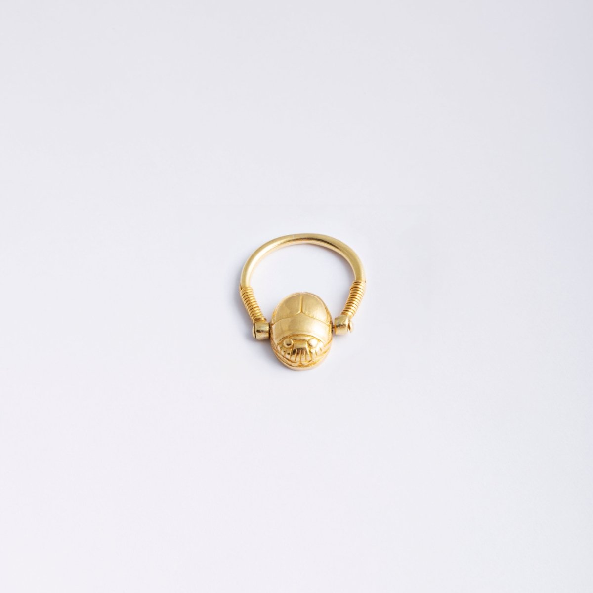 Ravissante bague en or jaune avec un motif central de Scarabée - Egyptomania, début du 19ème siècle. Poids 7,8 g Tour de doigt : 54 Référence : SR3 Tous nos bijoux sont authentifiés par nos experts.