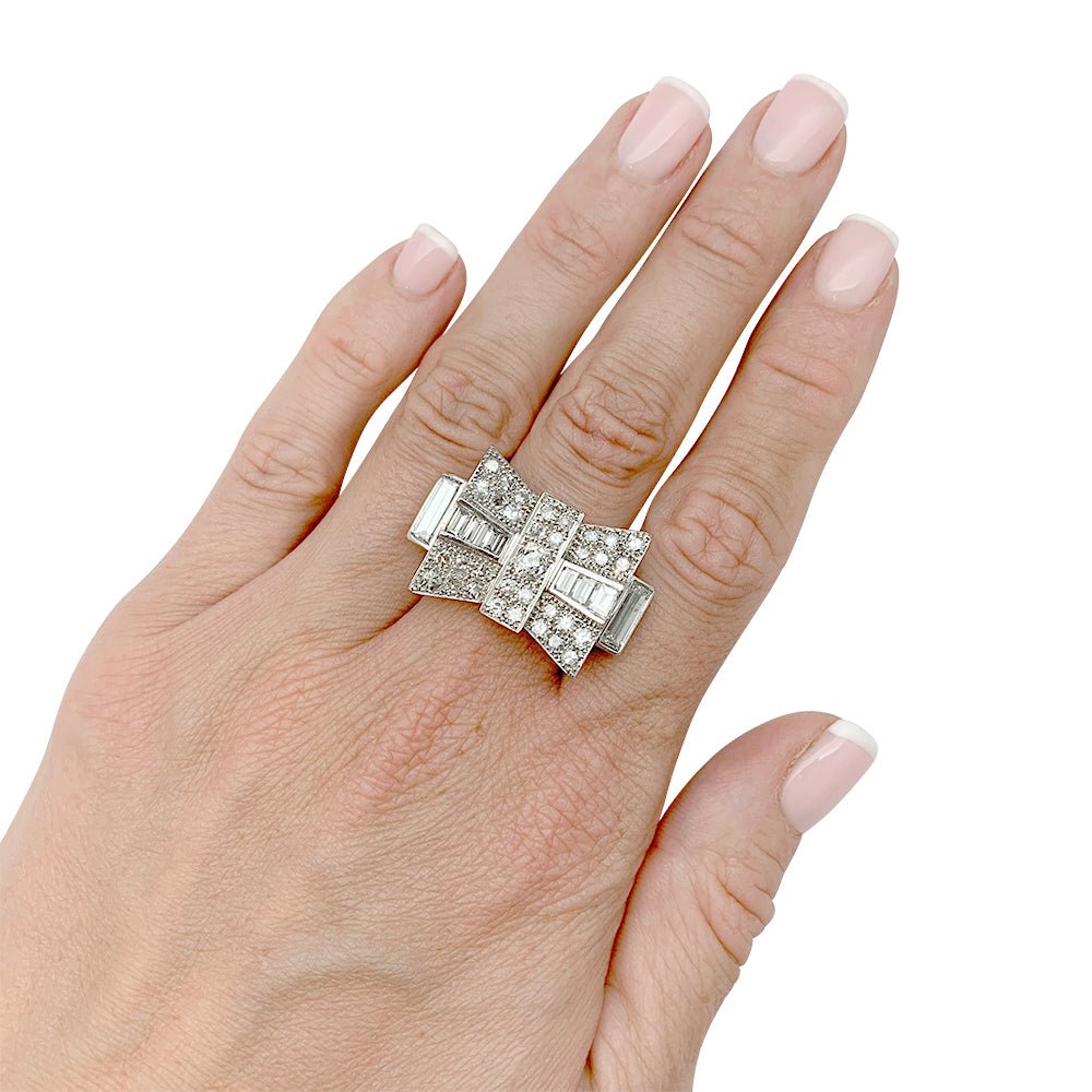 Une bague noeud “Tank” en platine 950/000, centrée d’un diamant taille ancienne, épaulé de diamants taille baguette entouré de diamants 8/8 et brillants. Longueur : 19 mm Largeur : 30 mm Hauteur : 7 mm Poids : 22,5 grammes Poids du diamant : environ 2,5 carats Tour de doigt : 57