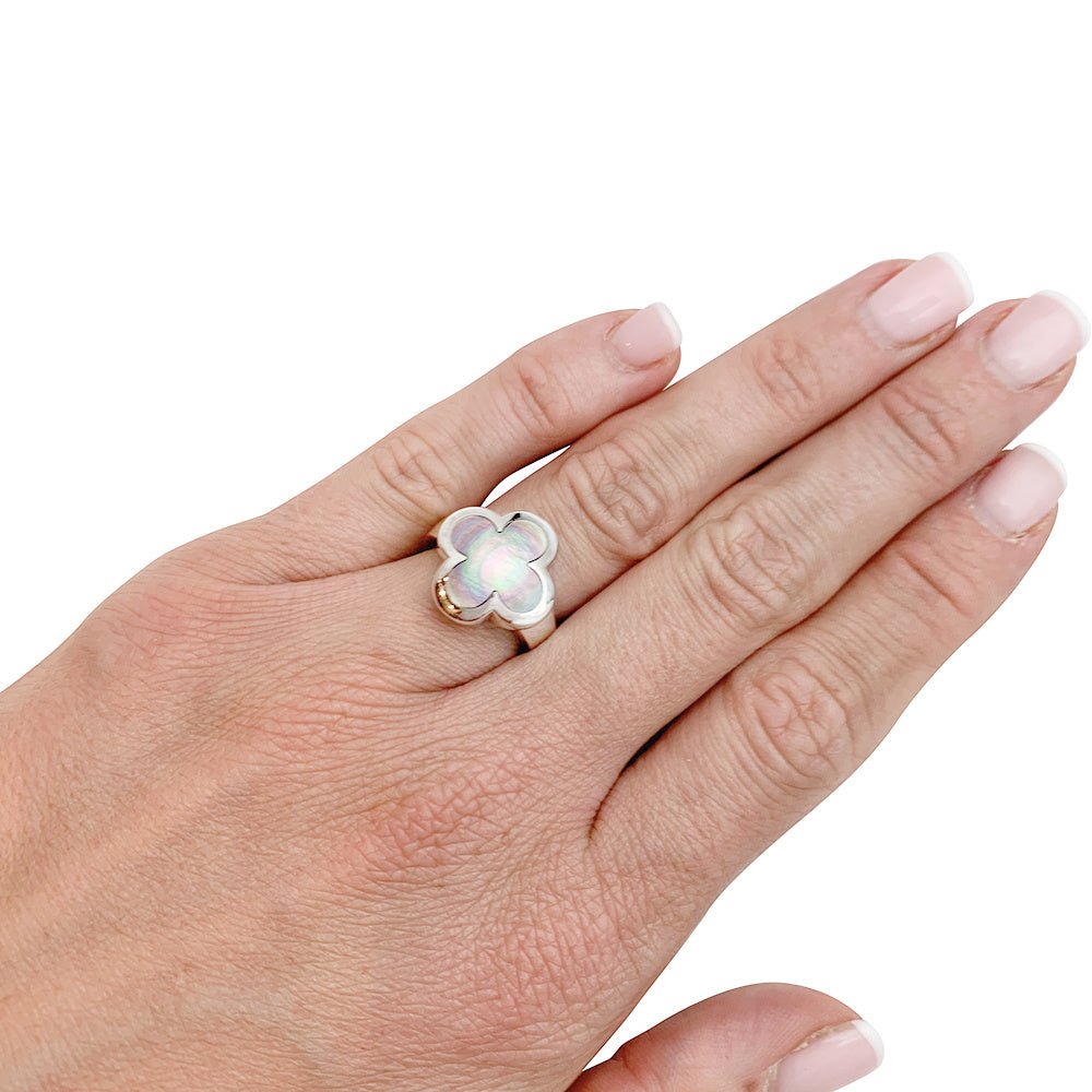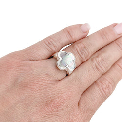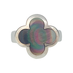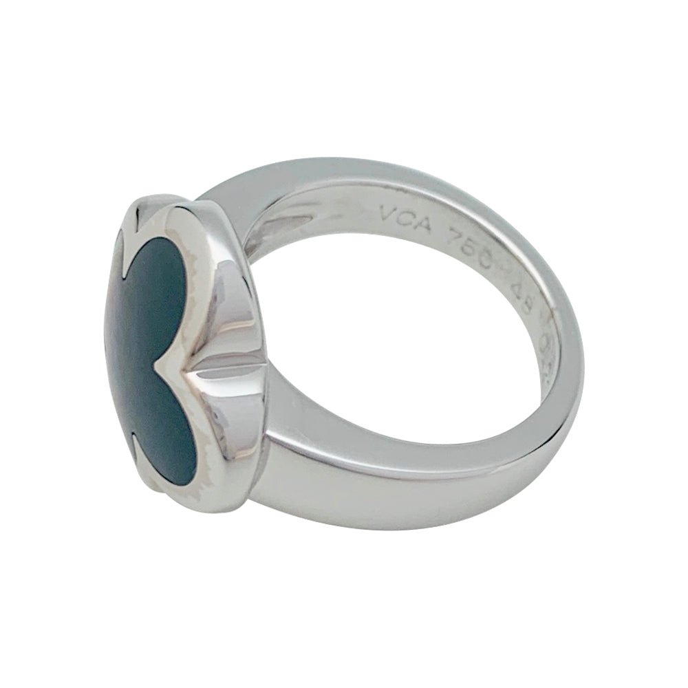 Une bague signée de la Maison Van Cleef & Arpels en or blanc 750/000, modèle “Pure Alhambra”, centrée d'un motif quatrilobé nacre grise. Longueur : 16 mm Largeur : 16 mm Hauteur : 5 mm Poids : 10,3 grammes Tour de doigt : 48
