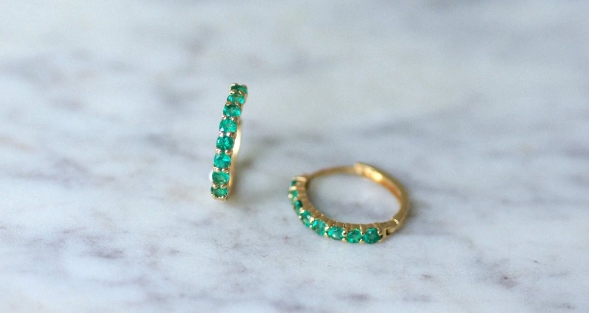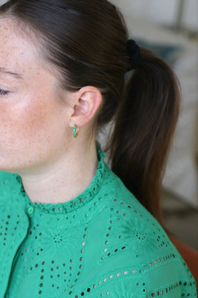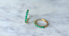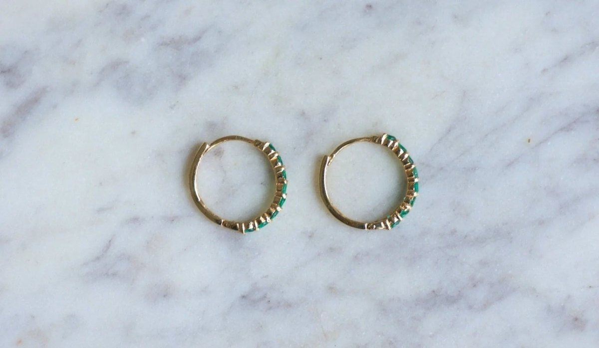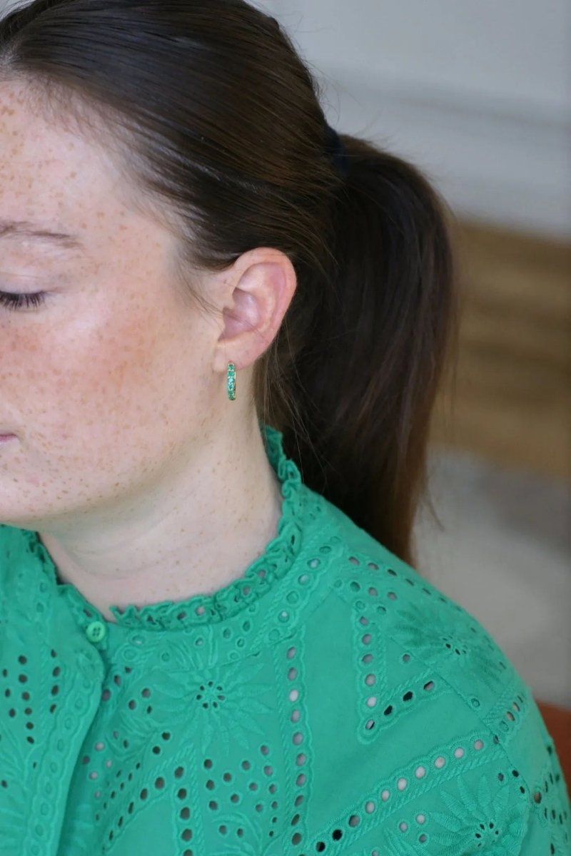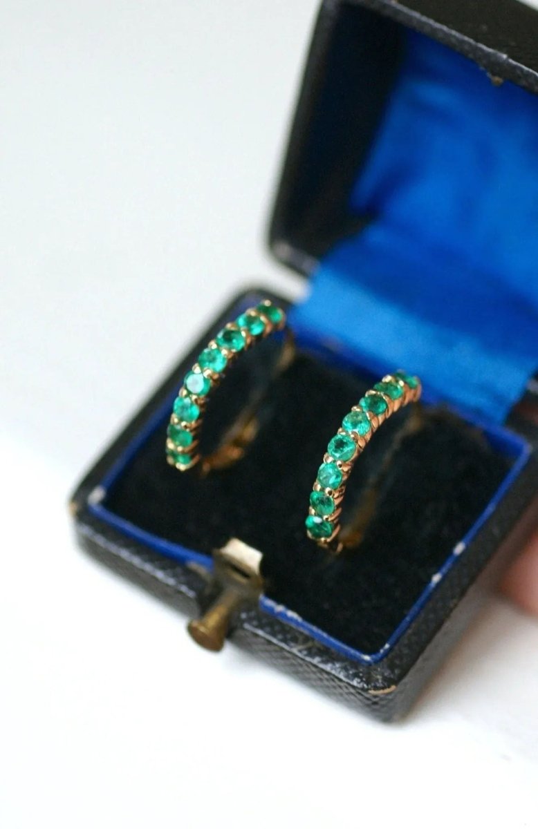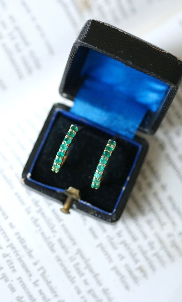 Délicates créoles en or jaune 18kt (poinçon : hibou) ornées d'émeraudes rondes ( origine probable: Colombie) dont le poids total est estimé à environ 0.90 Ct. Travail vintage. Poids brut: 3.37 gHauteur: 1,90 cmDiamètre: 2.00 cm État: très légères micro rayures sur les parties or, inclusions naturelles dans les émeraudes, voir photos. Saviez-vous que les créoles seraient originaires de Mésopotamie? On leur prêtait le don de protéger les oreilles, portes ouvertes aux esprits et siège de l’intelligence... Aujourd'hui, elles nous renvoient surtout aux Antilles où les femmes portaient toutes ces boucles d'oreilles depuis des siècles. Ces boucles y sont même devenues par la suite un signe d’affranchissement car, selon la tradition, les enfants de familles aisés remerciaient leurs nourrices en leurs offrant des grains d’or qu’elles transformaient en créoles. Toutes nos boucles d'oreilles anciennes.