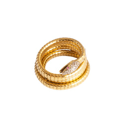 Bracelet de bras en or jaune 18 carats en forme de serpent, la tête sertie d'un diamant dans un entourage de diamants, les yeux sertis de rubis. Travail français du 19ème siècle.