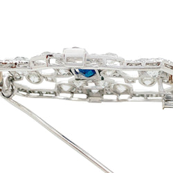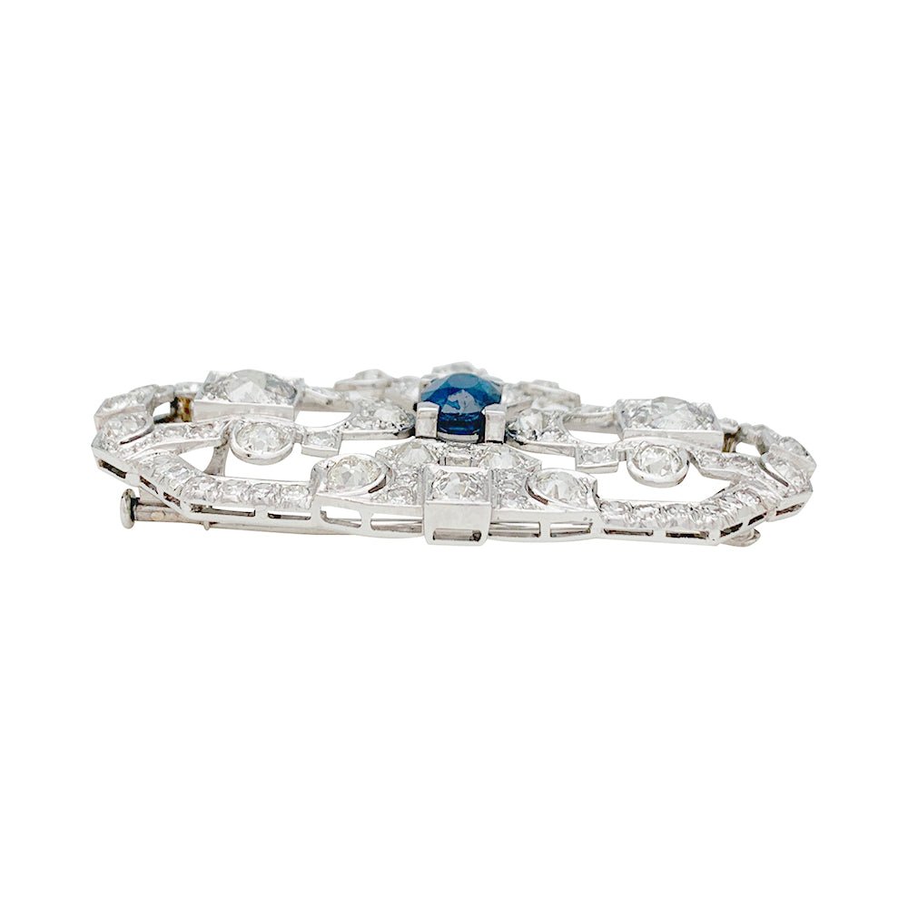 Broche Plaque, à motif géométrique, centrée d’un saphir ovale, épaulé de diamants taille ancienne entourés de diamants taille ancienne et 8/8 totalisant.