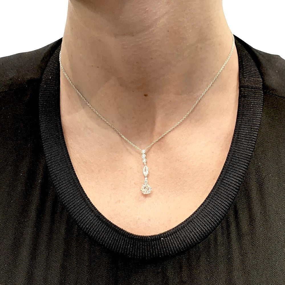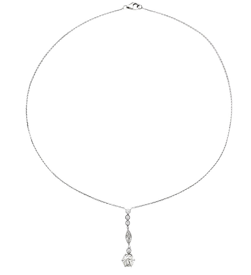 Un collier en or blanc 750/000 retenant un pendentif constitué d’une ligne de diamants taille navette et ancienne retenant un diamant taille ancienne de 1,20 carat, chaton en platine 950/000. Qualité estimée: I, SI. Longueur : 400 mm Poids : 3,9 grammes Poids du diamant : environ 1,70 carat au total