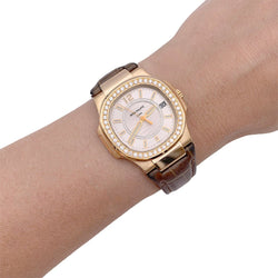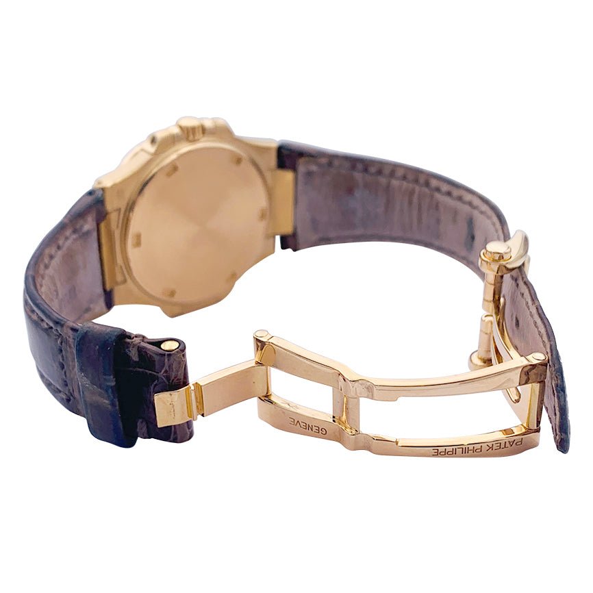 Une montre signée de la Maison Patek Philippe, modèle 'Nautilus', composée d'une lunette sertie de diamants taille brillant sur un boitier en or rose 750/ooo, d'un bracelet en cuir avec une boucle double déployante en or rose 750/ooo. Le cadran est doré, d'exterieur lisse avec un centre au relief horizontal frappé. Index appliqués avec un revêtement luminescent et une date à 3 heures . La collection Nautilus fut crée dans les années 1970 par le designer Gérald Genta, qui créa notamment la Royal Oak d’Audemars Piguet quelques années auparavant. Longueur : 40 mm Largeur : 35 mm Diamètre : 32 mm Poid du diamand : 46 diamants pour un total estimé de 0,73 carat. Mouvement : Mouvement quartz Boite d'origine : Oui