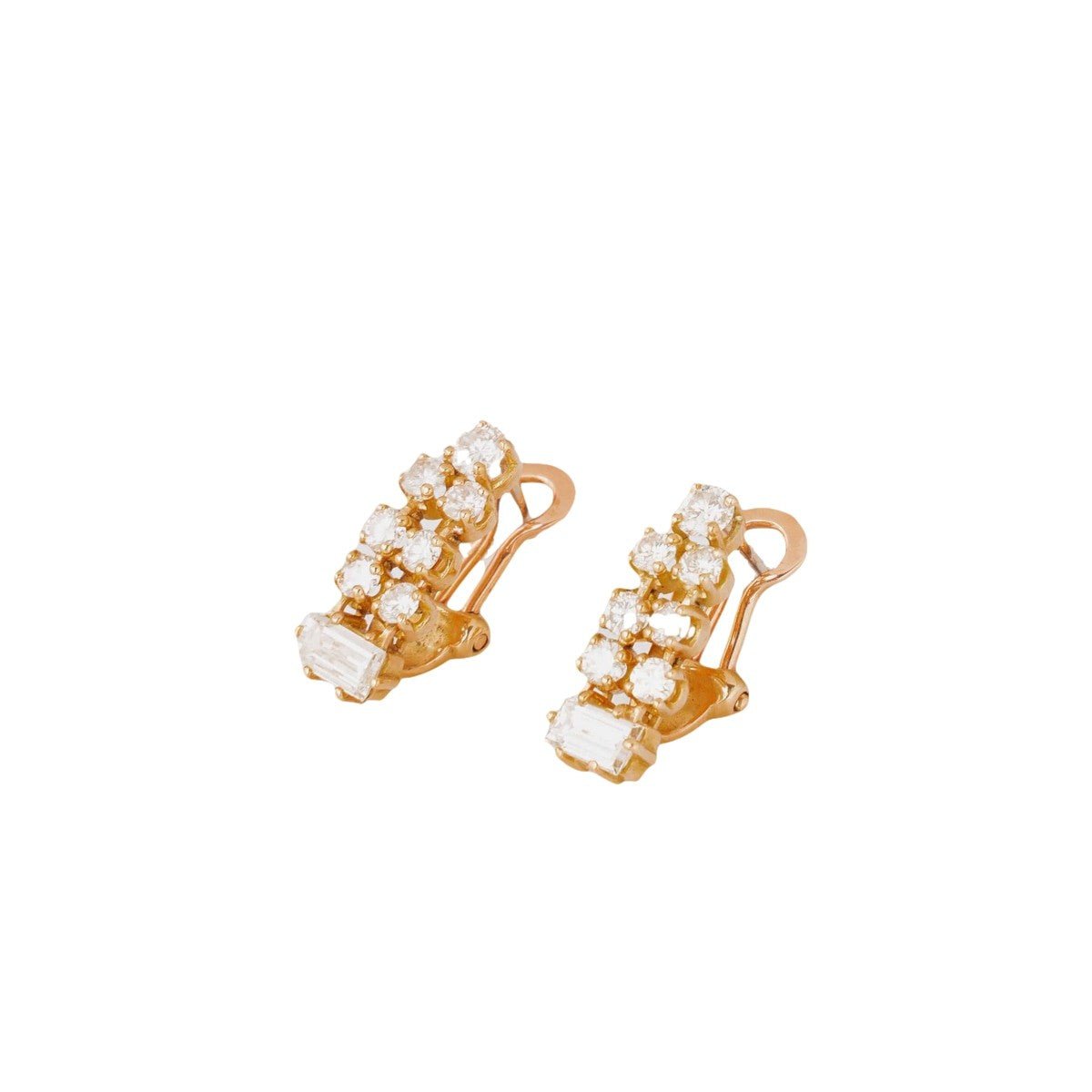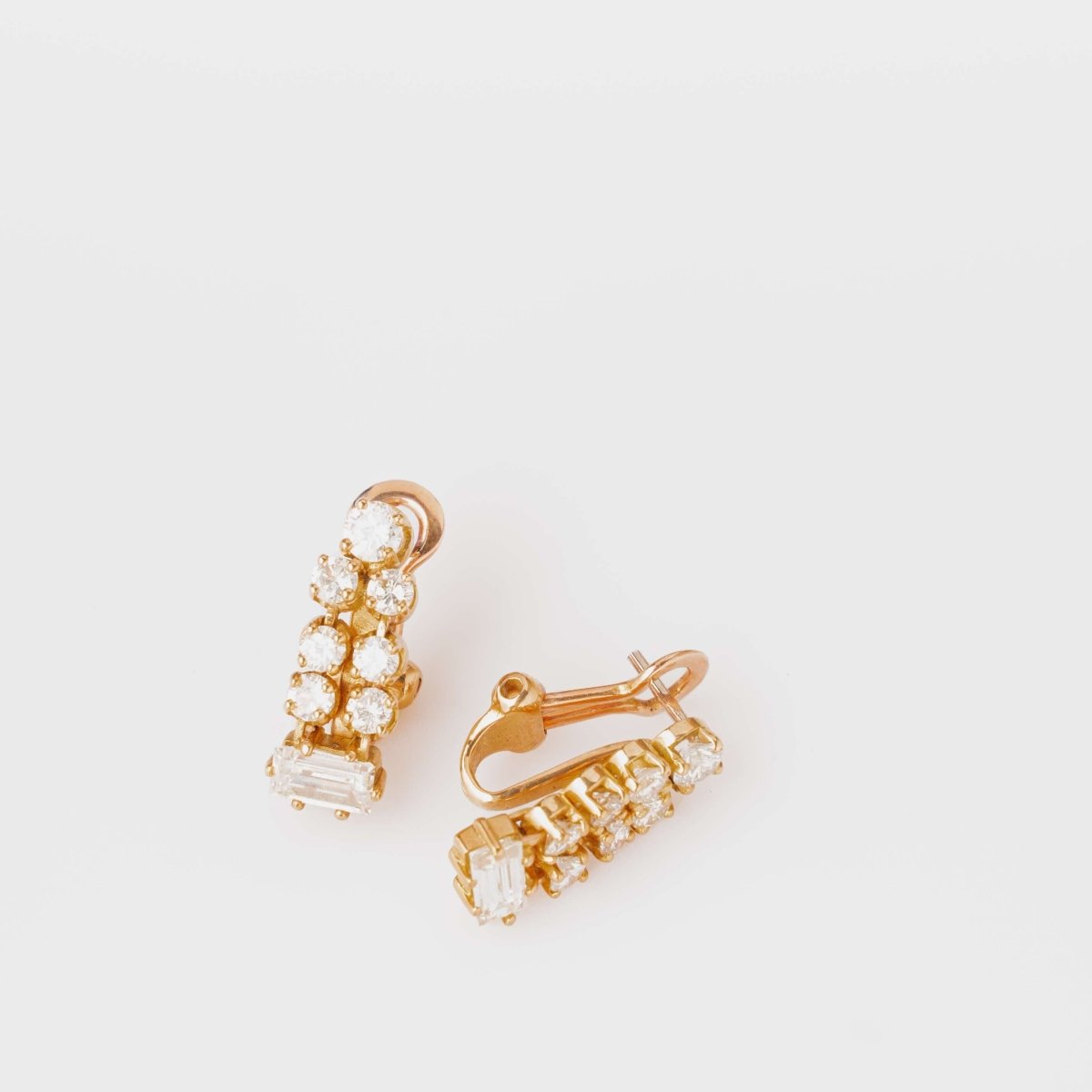 Paire de boucles d'oreilles en or jaune 18 carats ornée de sept diamants et se terminant par un diamant baguette. Très bon état.