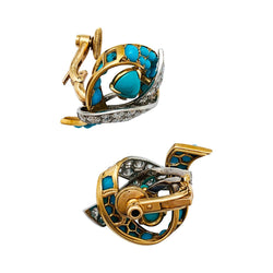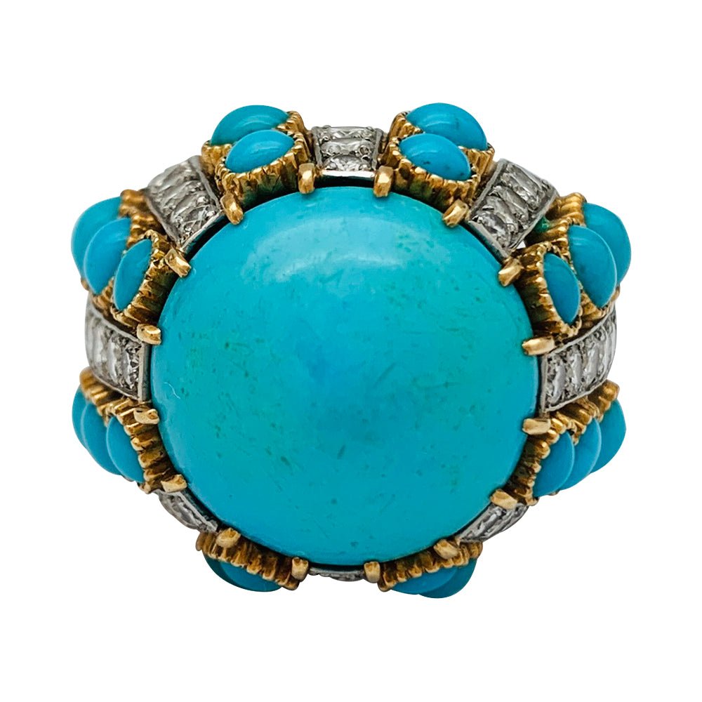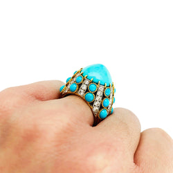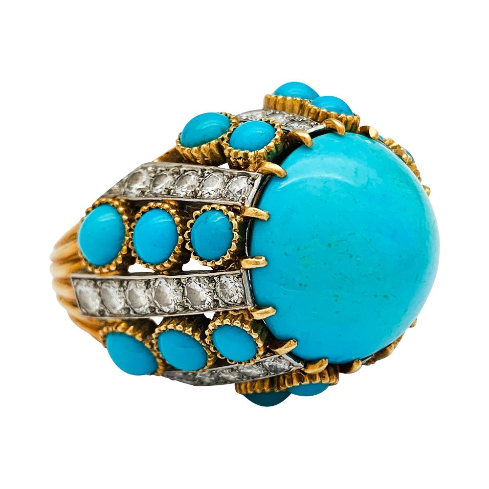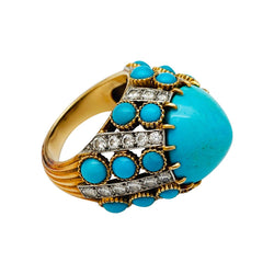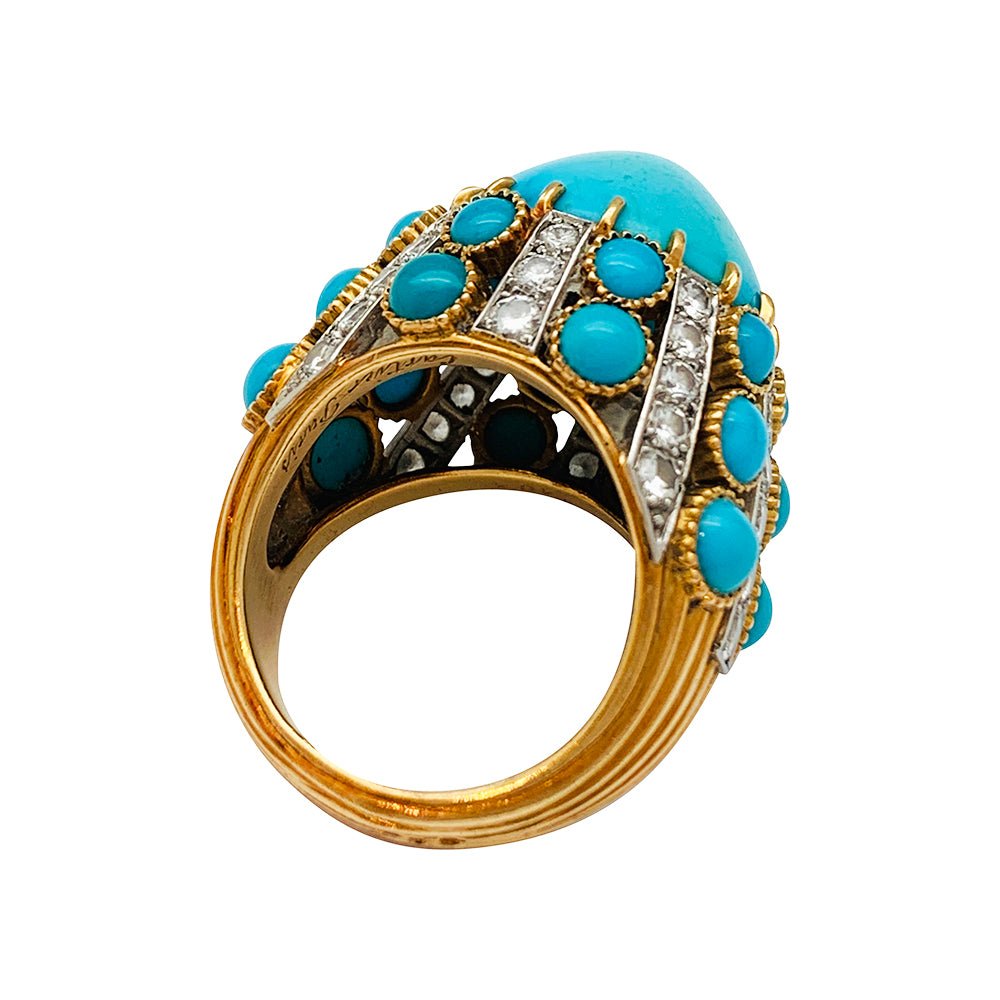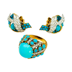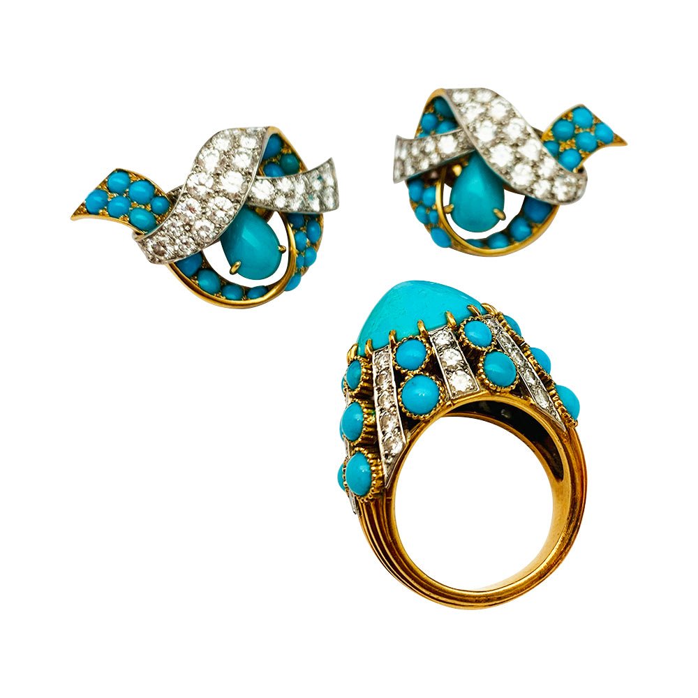 Une parure vintage signée de la Maison Cartier composée de : Une paire de boucles d’oreilles signée Cartier Paris en or jaune 750/000 et platine 950/000 formant des volutes serties de cabochons de turquoise et de diamants taille brillant. Une bague signée Cartier Paris de forme 'Dôme' en or jaune 750/000 centrée d'un important cabochon de turquoise, la monture à décor de lignes de turquoises et de diamants taille billant sertis sur platine 950/000. Poids : Boucles d'oreilles : 17,7 grammes. Bague : 16,6 grammes. Tour de doigt : 55