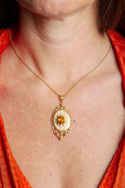 Pendentif en or jaune 18 carats serti d'un saphir jaune synthétique dans un entourage de perles. Années 1950. Poids brut : 8,50 g.