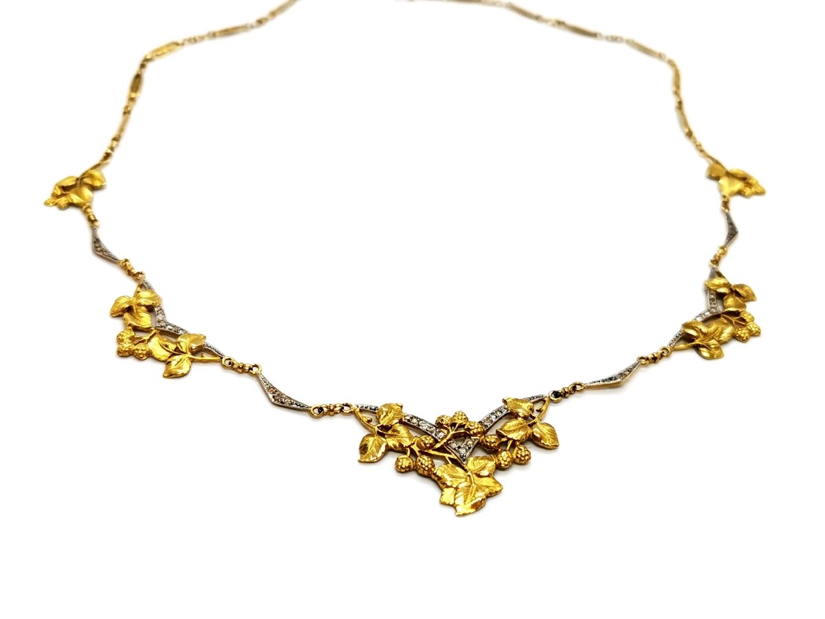 Art deco necklace. two-tone. in 750 thousandths (18 carat) yellow gold. set on platinum. of 29 diamonds (rose cut). for approximately 0.15 ct in total. leaf patterns. pretty work from the 1930s. length: 45 cm. chain width: 0.27 cm. central motif dimensions: 3.6 cm x 1.8 cm. total weight: 13.62 g. hallmarked with an eagle's head. excellent condition