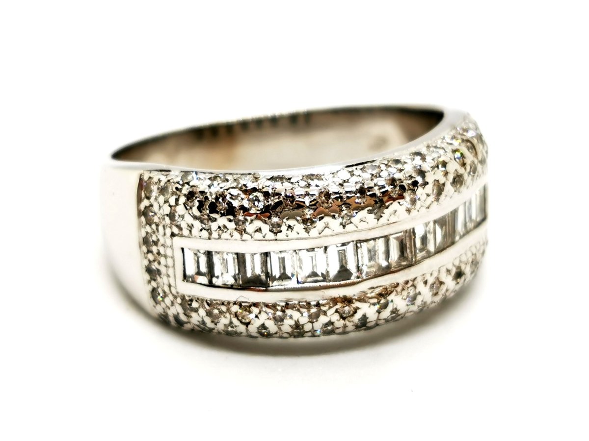 Ring in 750 thousandths (18 carat) white gold. set with a total of 116 diamonds. including 13 baguette diamonds. for approximately 0.45 ct in total. and 103 brilliant-cut diamonds. for approximately 0.50 ct in total. total diamond weight: approximately 0.95 ct. finger size: 70. width on top: 1.1 cm. total weight: 11.24 g. eagle head hallmark. excellent condition