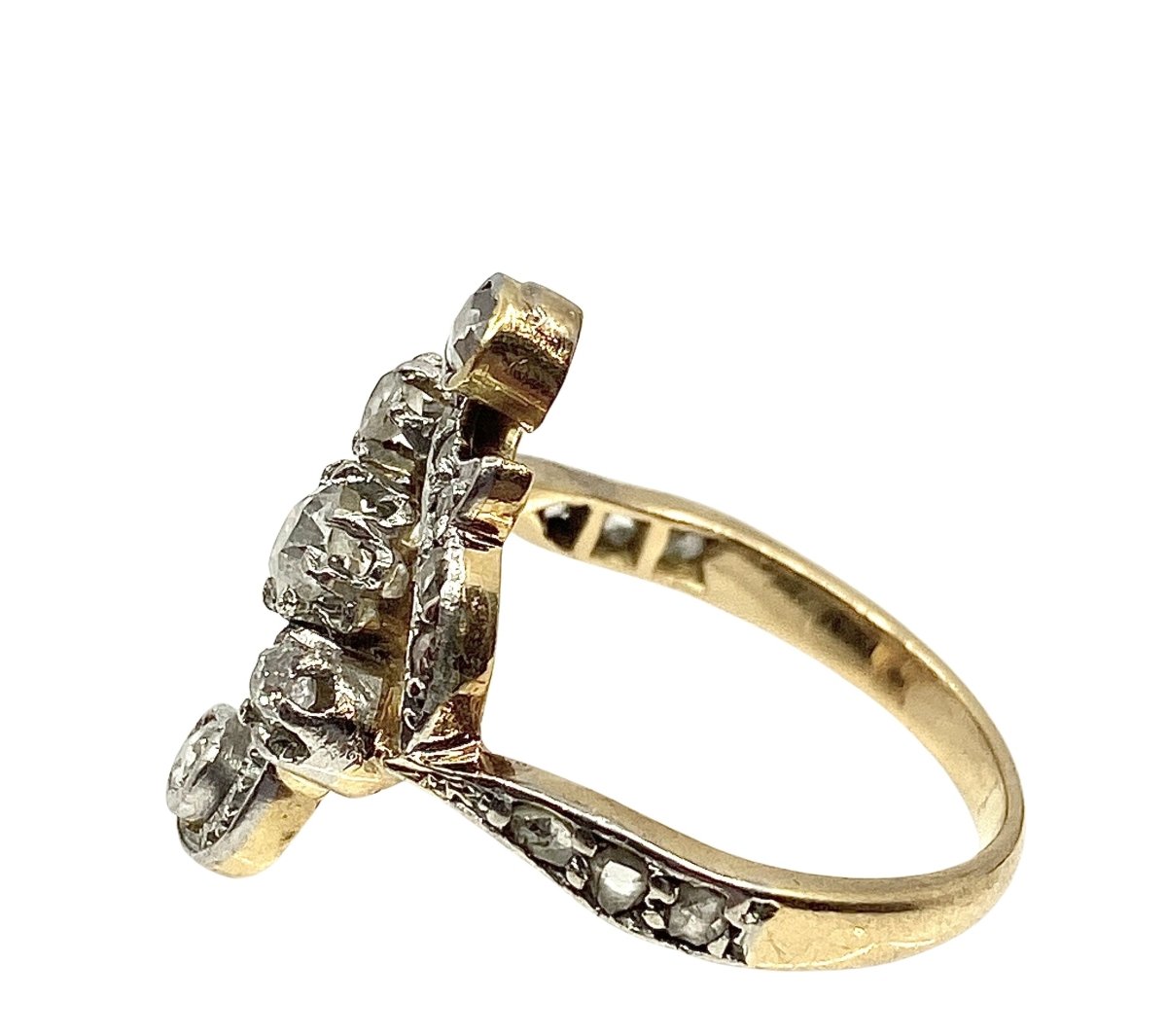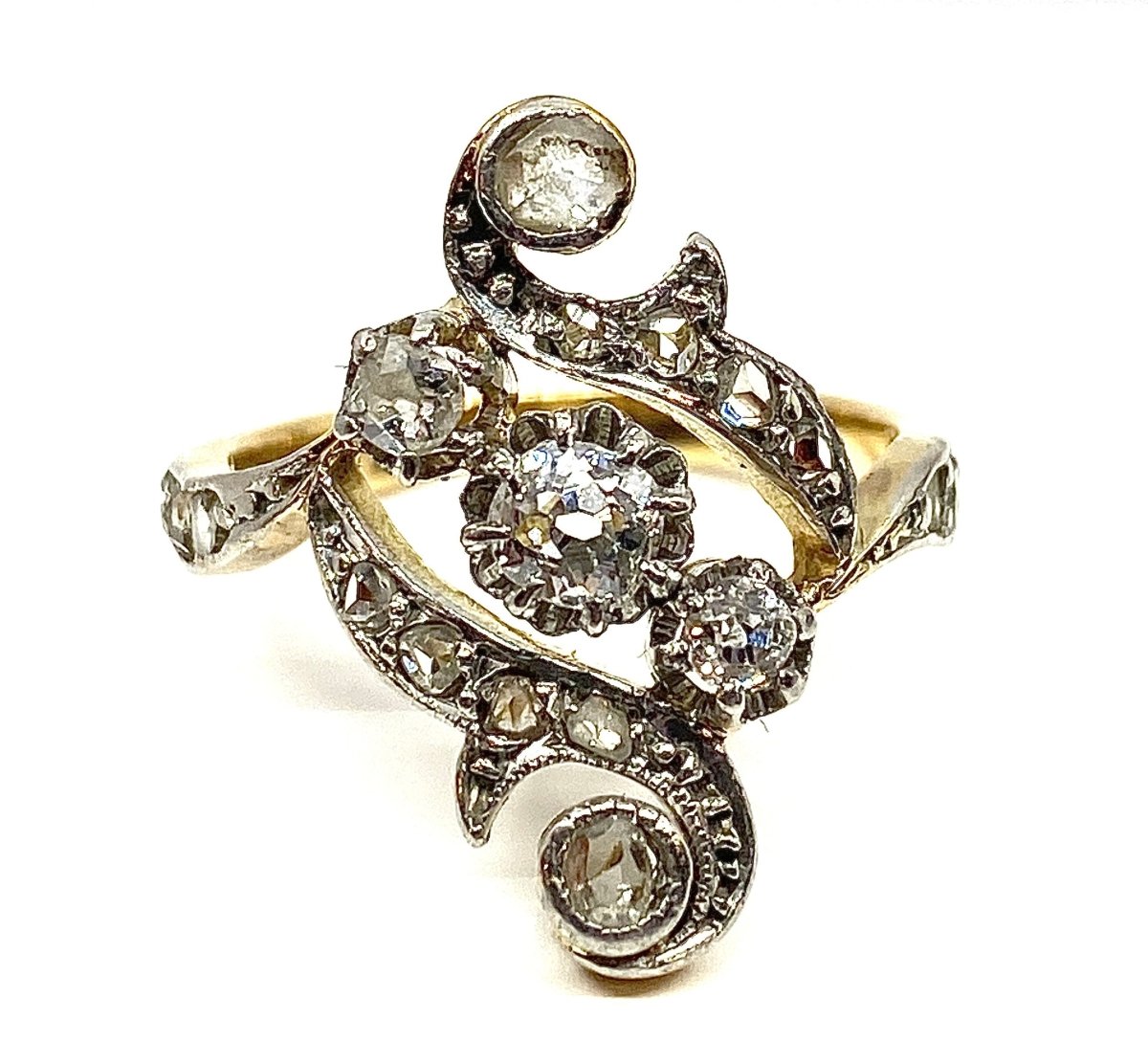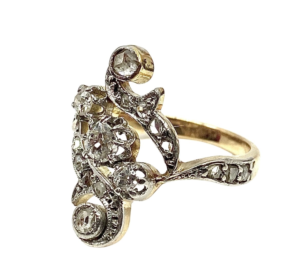 Ring in 18-carat yellow and white gold set with 3 old-cut diamonds in the center in a setting adorned with 16 rose-cut diamonds.