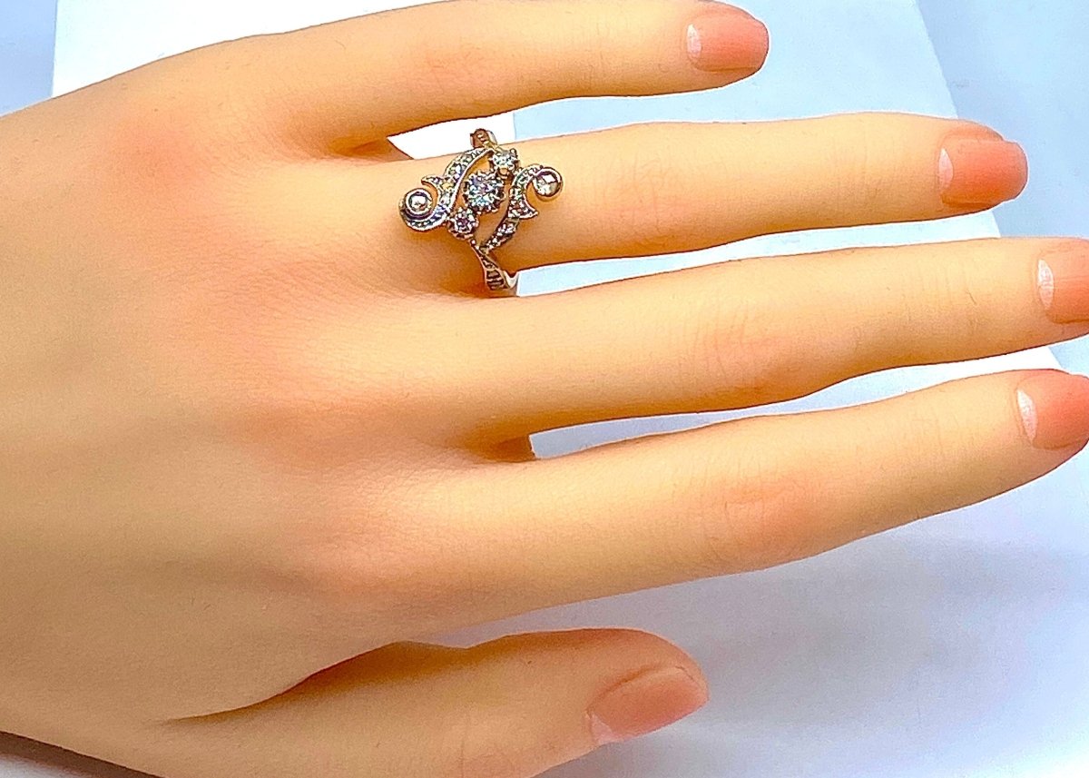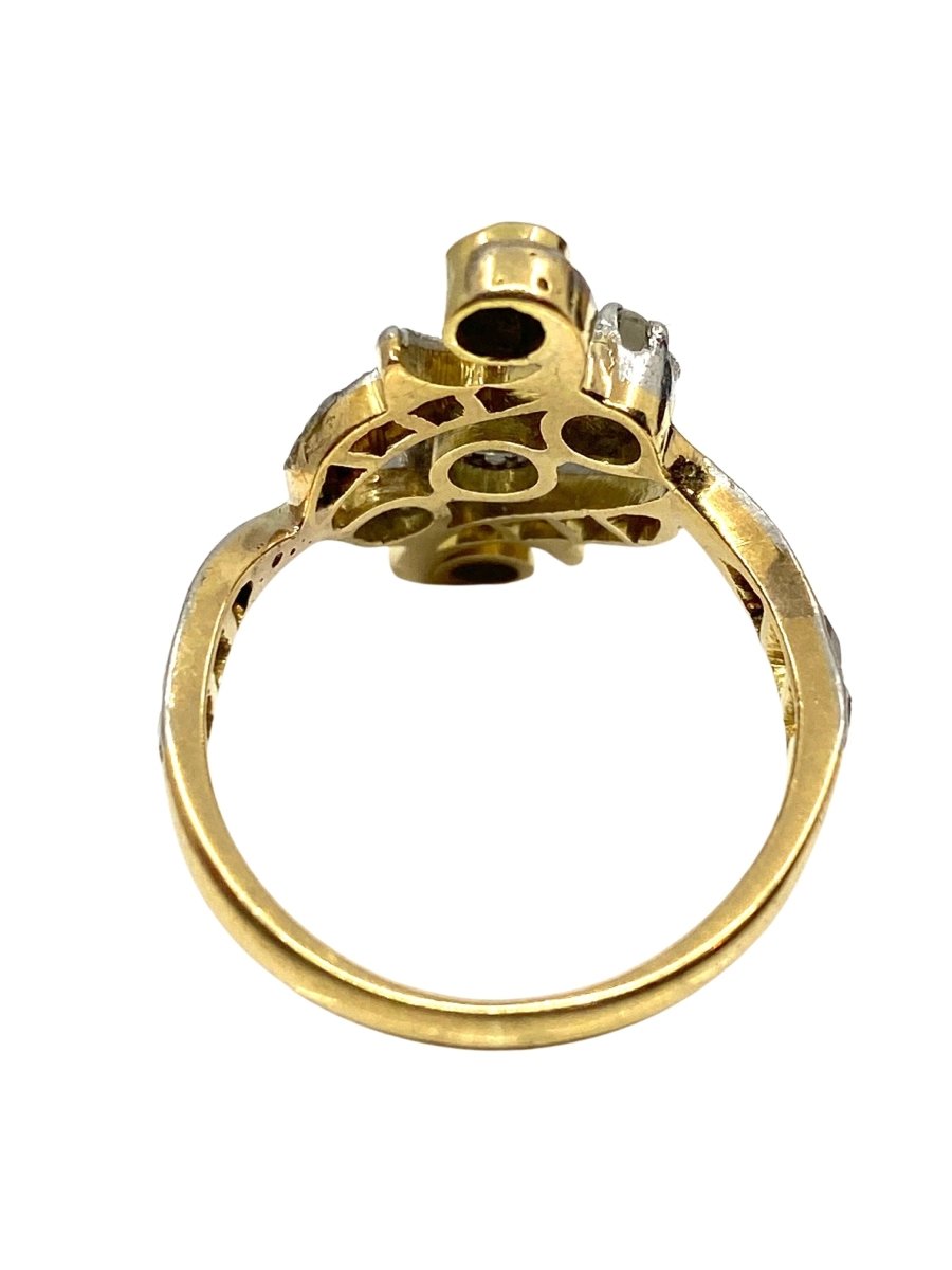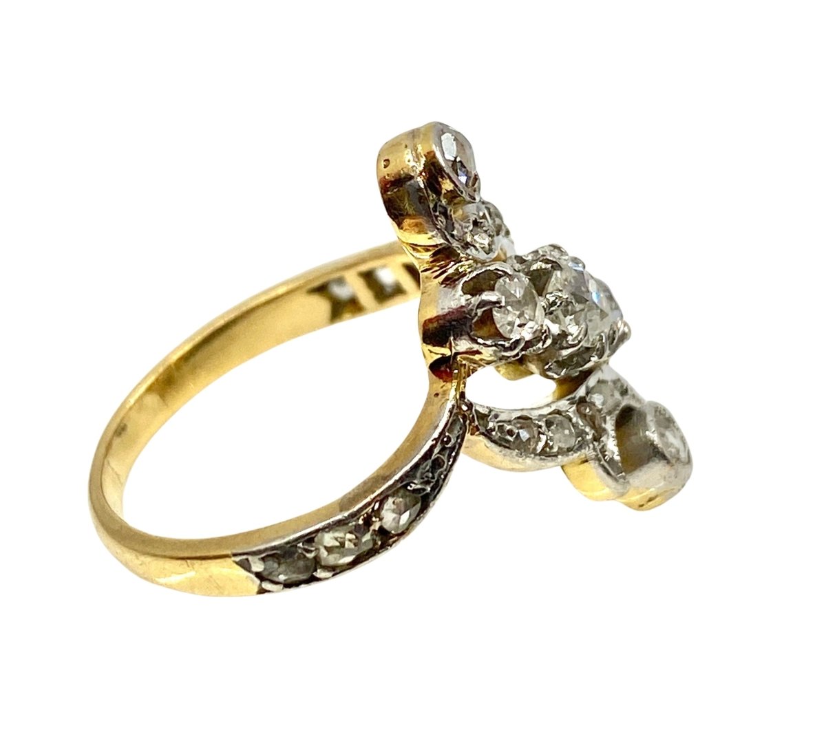 Ring in 18-carat yellow and white gold set with 3 old-cut diamonds in the center in a setting adorned with 16 rose-cut diamonds.