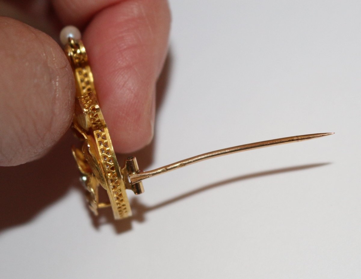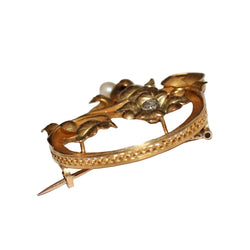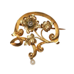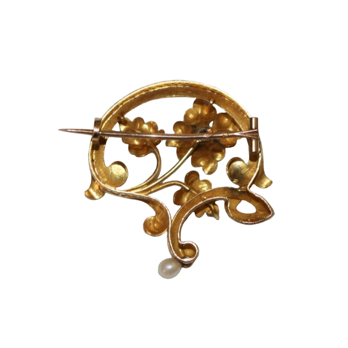Clip brooch in 18-carat yellow gold forming a stylized floral motif, centered with a rose and holding a small pearl Gross weight: 4.68 g Dimensions: 3.2cm x 3.5cm Eagle head and French goldsmith hallmarks