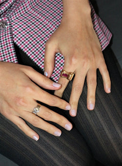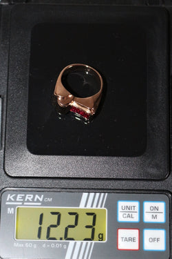 Tank ring from the 1940s in 18 ct (750/1000) yellow gold set with 4 calibrated red stones: synthetic rubies. Finger size: 51 Hallmarks: eagle head Condition: good general condition: repolished jewel, micro-shock on one stone Gross weight: 12.23 g ref.506 The Tank jewel: The Tank jewel stands out with its exuberant volume, like the military vehicle from which it takes its name. The ring is often set with natural diamonds and synthetic rubies. Indeed, the use of synthetic stones was common at that time. We must also keep in mind that in the middle of the Second World War, priority was not given to the extraction of natural precious stones for jewelry: it is therefore not uncommon to find synthetic rubies set on jewelry very good quality. This is part of the characteristic style of this era! I would like to point out that this is not a new item or refurbished, it is sold as is and therefore shows wear and small imperfections due to its age.