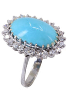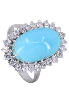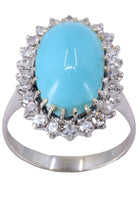 Type of jewelry: Ring Metal: 18 carat (750/1000) white gold Genre: Modern Weight: 4.9g Stones: Turquoise - Diamonds Turquoise weight: approximately 4.89 carat Diamond weight: approximately 0.72 carat (24 x 0.03 carat) Size: 53 - Size on request Hallmark: Owl
