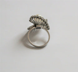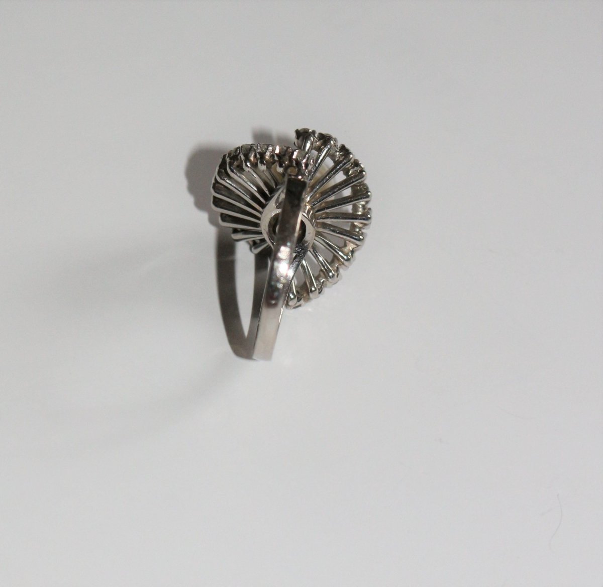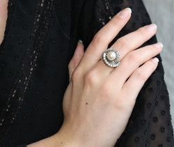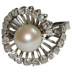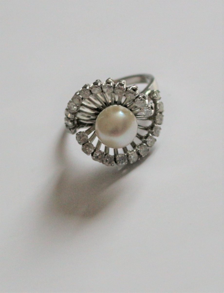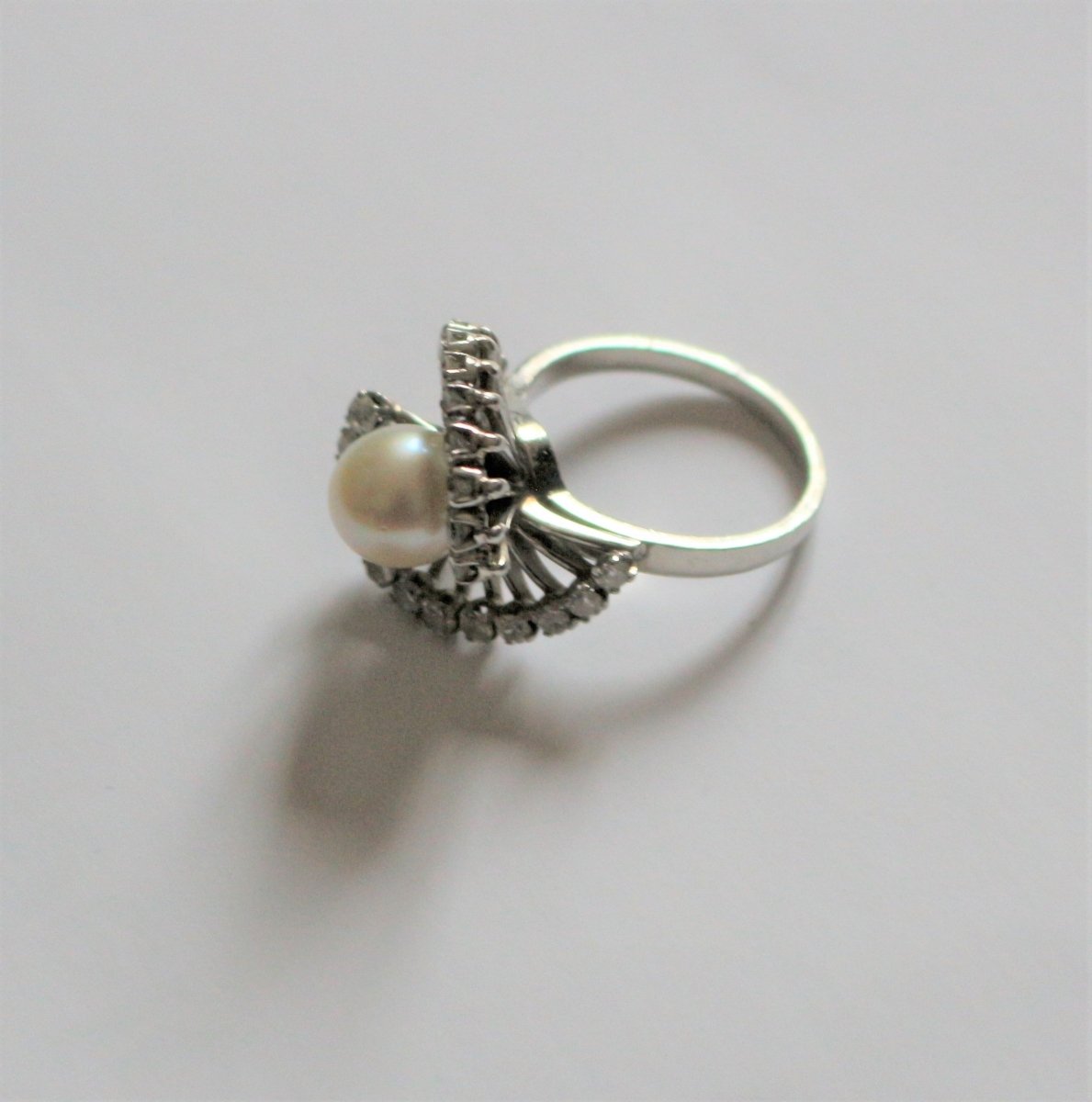 Cocktail ring in 850 thousandth platinum centered with a white cultured pearl in a stylized openwork surround ending with 24 diamonds. Gross weight: 10.41 g Finger size: 55 Pearl diameter: 9 mm Diameter of diamonds: 2 mm Mask punch