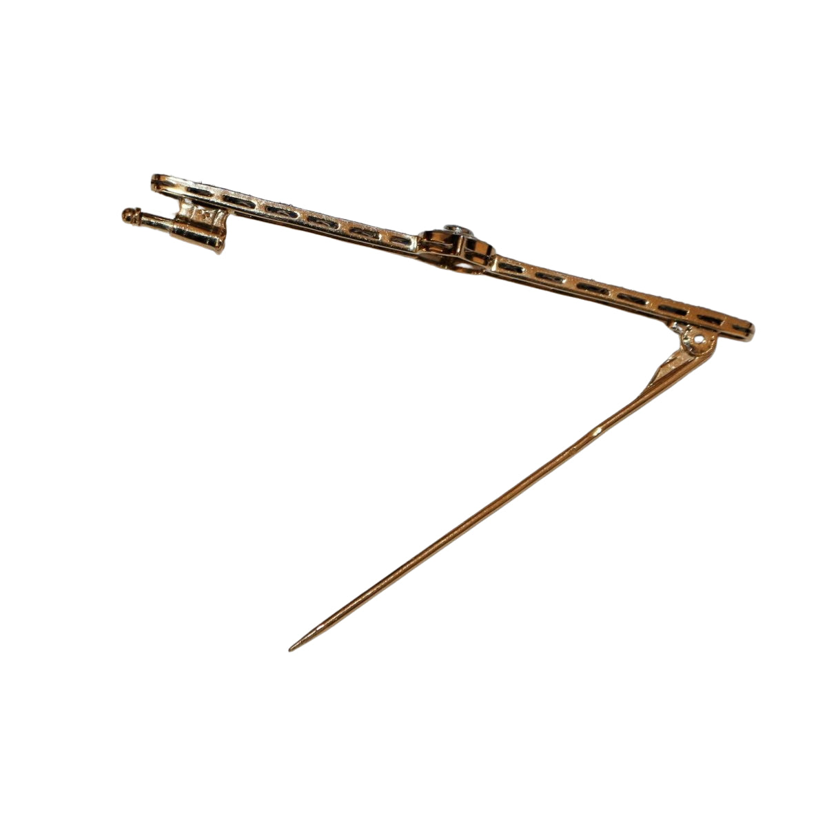 Barrette brooch in yellow gold and platinum decorated with a very fine geometric design, paved with 38 diamonds and 26 small sapphires in a back-to-back triangle around a central diamond Gross weight: 5.74 g Diamond size: 1 mm Size of central diamond: 3 mm Length: 6.8 cm Width: 1.3 cm Owl, mascaron and diamond punches Small restoration: 1 small diamond replaced