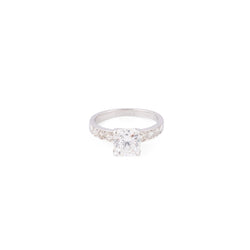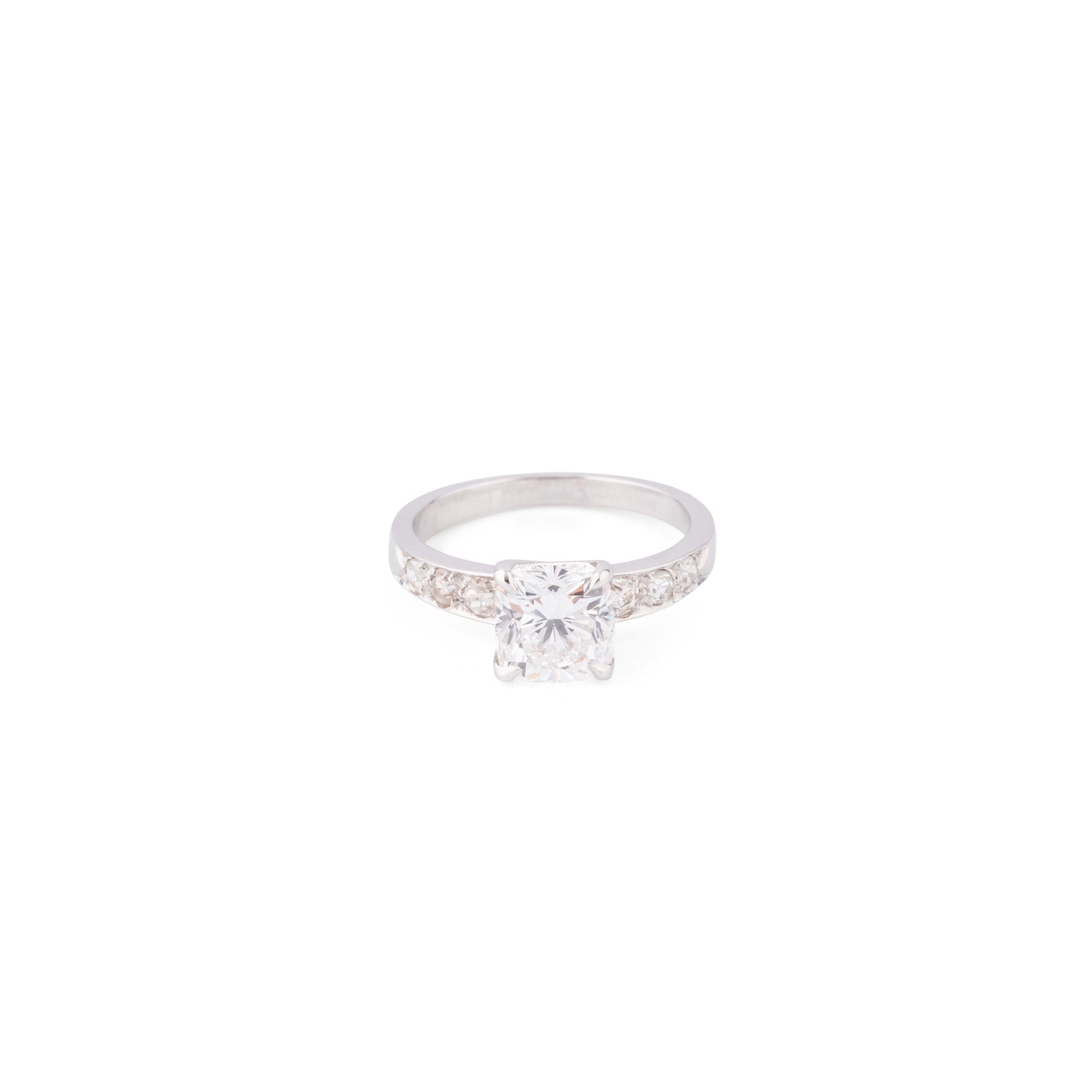 Solitaire ring in 750/1000 white gold (18 carats), cushion-cut diamond of 2.30 carats, surrounded by six diamonds. LFG Certification Color E (Exceptional White) Purity Vs1. Total weight: 4.3g. Finger size: 52. Period: 2000s.