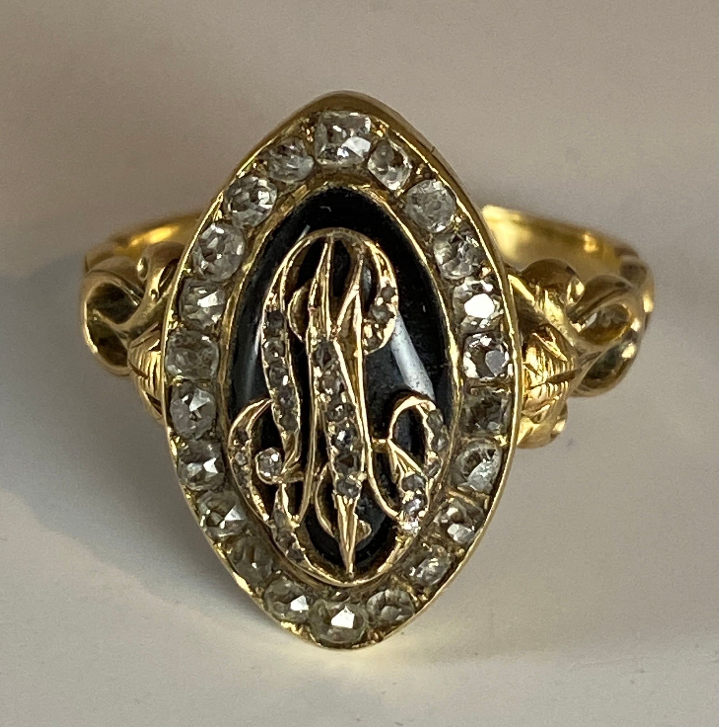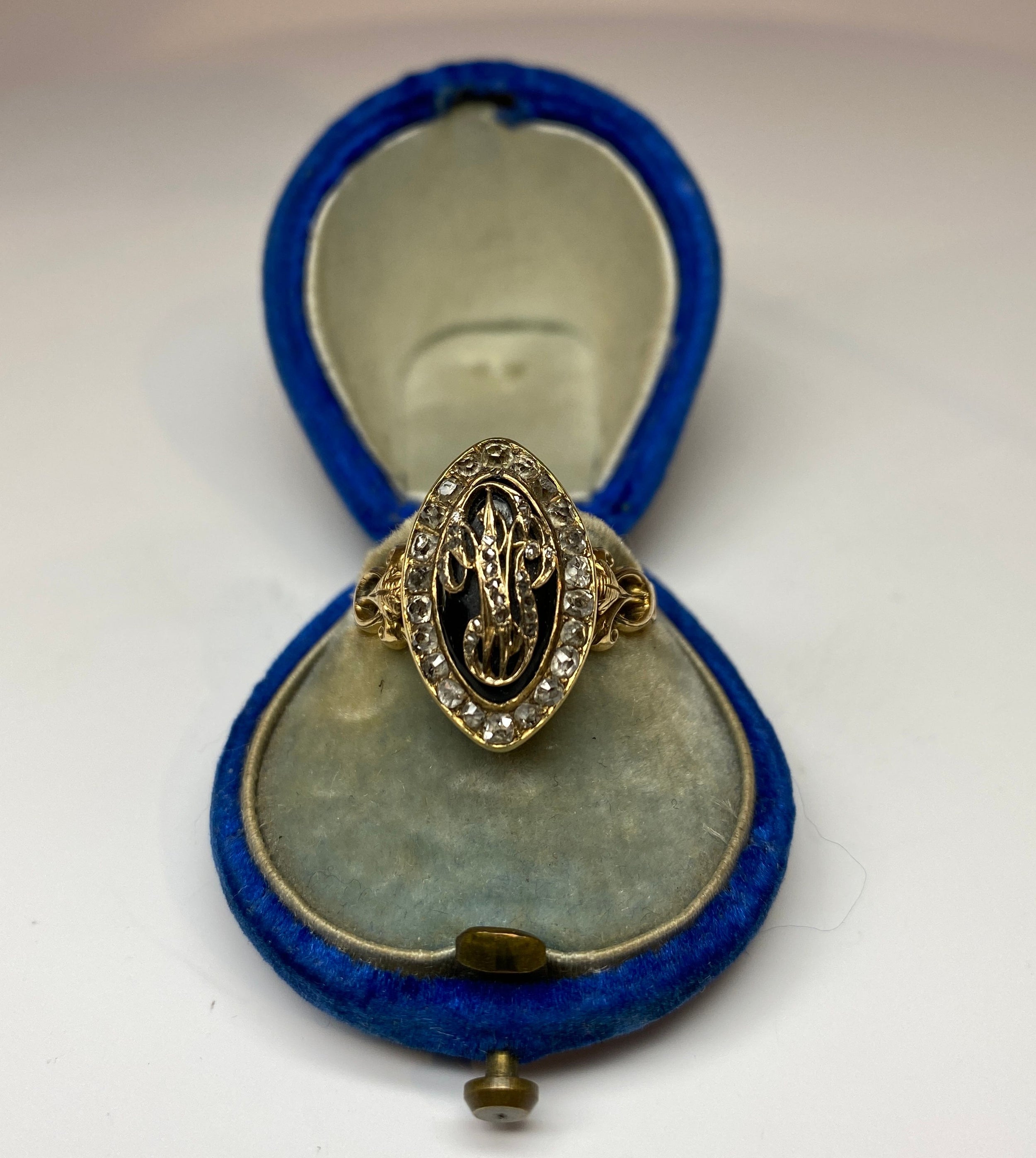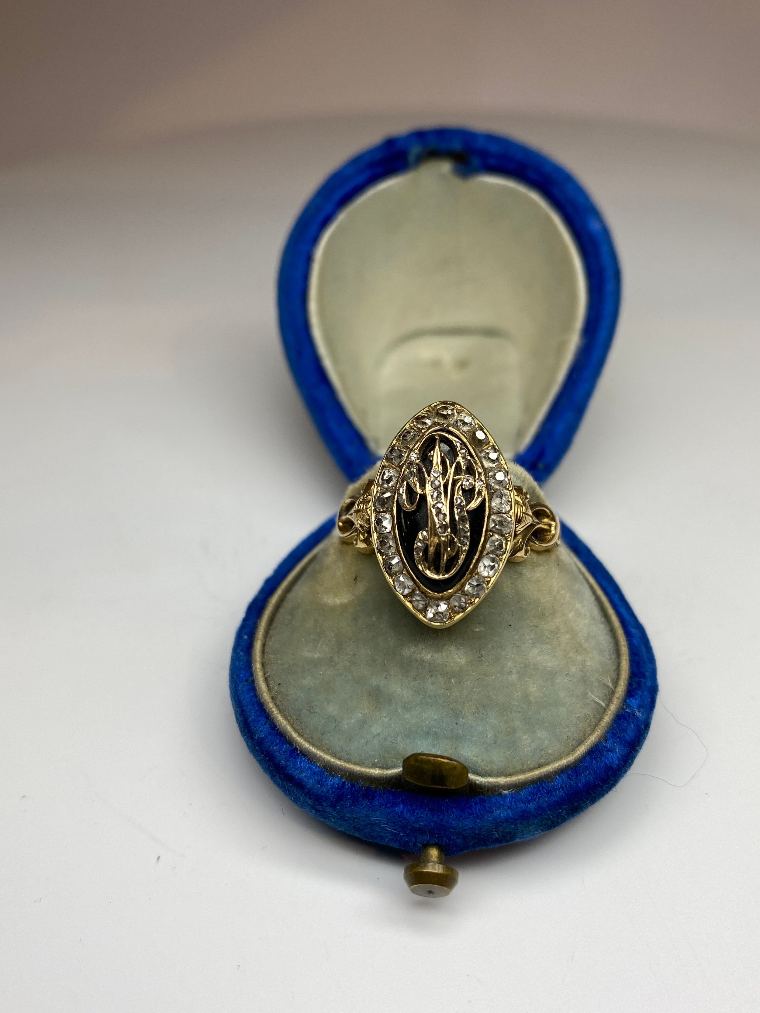 Marquise-shaped 18-carat gold ring adorned on top with a double gold initials set with rose-cut diamonds on a blue enamel base, all surrounded by rose-cut diamonds.