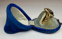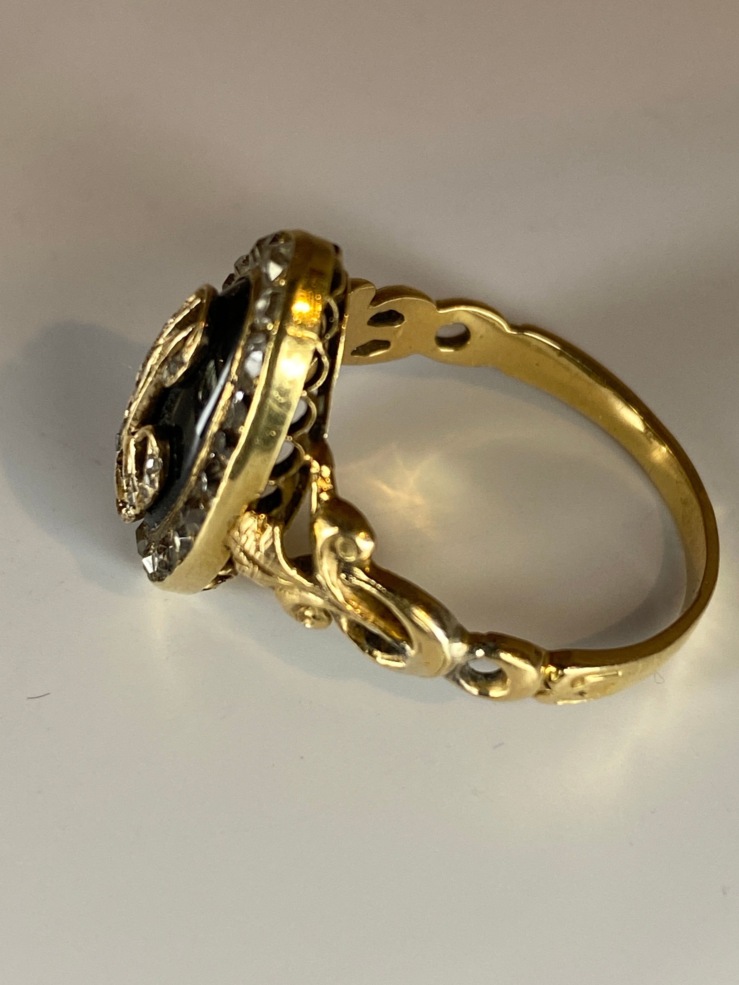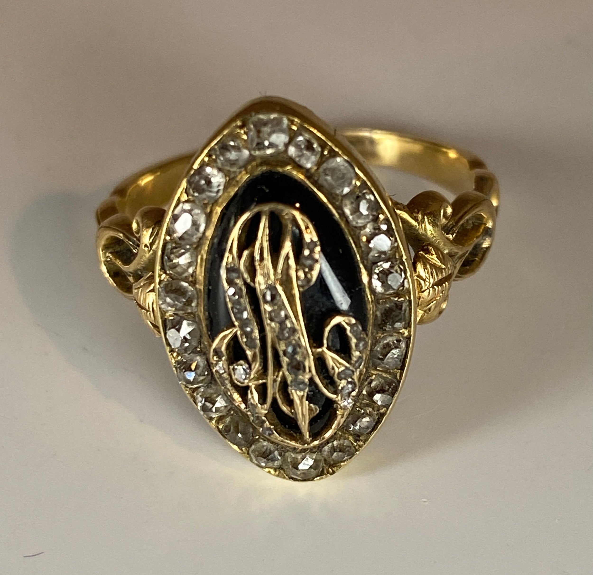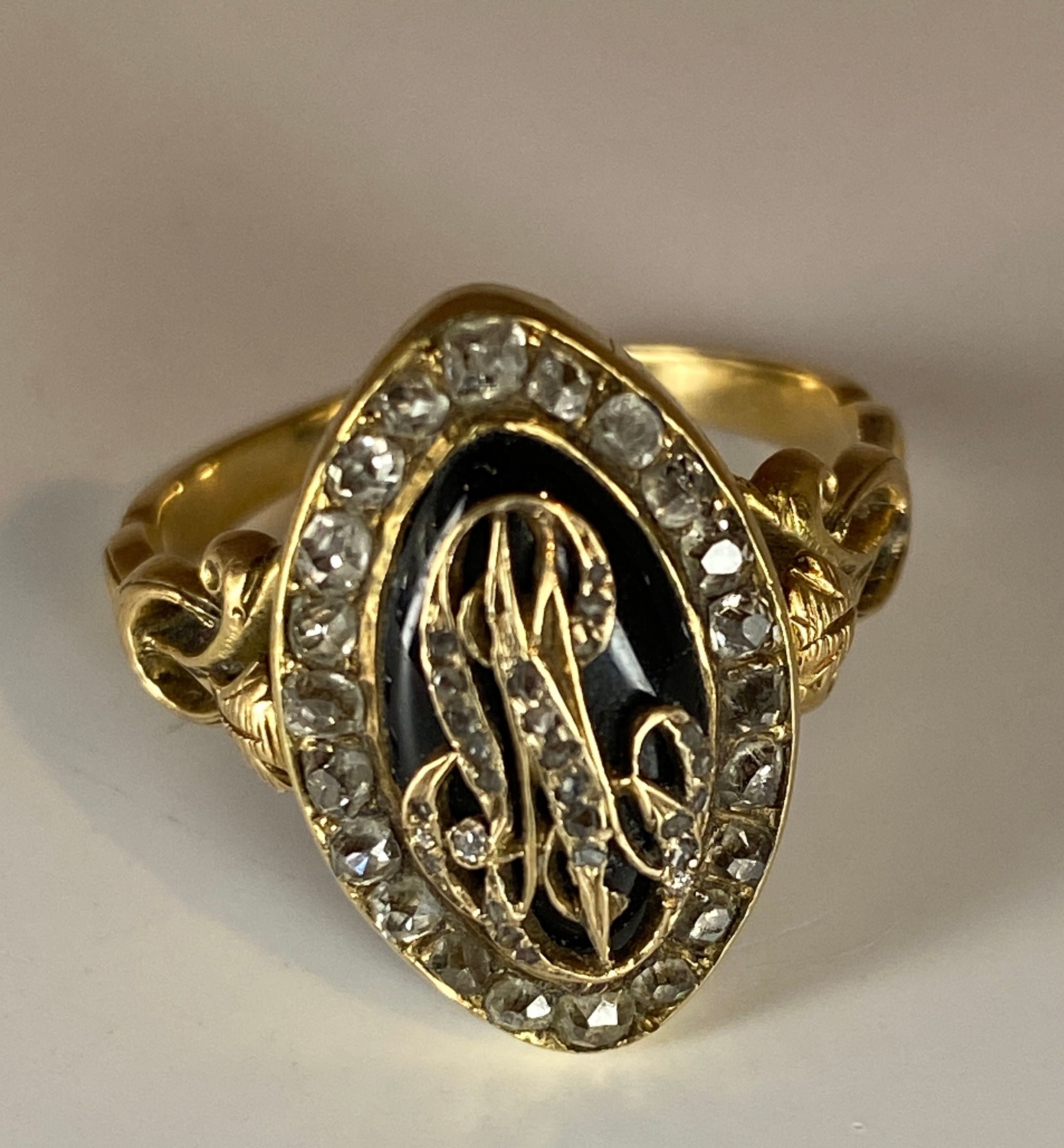 Marquise-shaped 18-carat gold ring adorned on top with a double gold initials set with rose-cut diamonds on a blue enamel base, all surrounded by rose-cut diamonds.